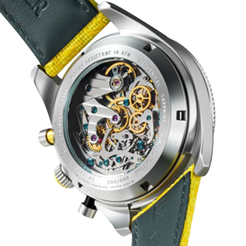 Spinnaker dévoile une montre qui allie le ludique à la fonctionnalité avec son modèle Fleuss Mechanical Chronograph Spongebob Squarepants Eyedial Limited Edition. Au total, on compte 500 pièces qui sont disponibles pour ce modèle. Le boîtier en acier inoxydable gris offre une structure solide et durable avec un diamètre imposant de 43 mm et une épaisseur de 14 mm, assurant une présence imposante et un confort optimal sur le poignet. Sa forme ronde classique permet d'accueillir un cadran emblématique à l'effigie de Spongebob, capturant immédiatement l'attention. Le fond du boîtier est vissé pour garantir une étanchéité optimale. Dotée de boutons fonctionnels, dont un bouton remontoir et deux boutons poussoirs, cette montre permet une manipulation aisée des différentes fonctions.