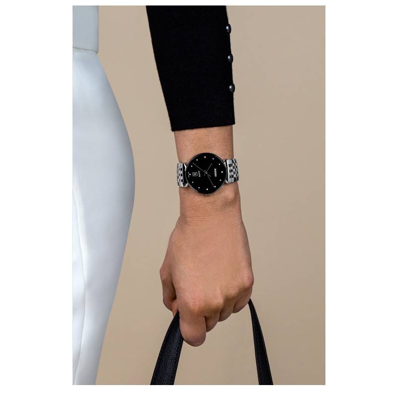 Signature de la marque Rado, la collection Florence Classic conjugue savoir-faire, design et haute qualité dans le respect des valeurs de la marque. Ses montres arborent un design harmonieux rappelant les tours et les dômes caractéristiques de la ville éponyme. Ils combinent fonctionnalité et haute qualité afin de perdurer dans le temps. Ce magnifique modèle Florence Classic Diamonds R48912733 que nous vous présentons dispose d'un boîtier rond en acier inoxydable poli qui mesure 38 mm de diamètre pour 8,7 mm d'épaisseur et dispose d'un poids de 124 grammes. Élégant et intemporel, il se destine à habiller les poignets des femmes et des hommes qui désirent ajouter une touche de sophistication à leur style. Son cadran est recouvert d'un verre saphir qui le protège des chocs et des dommages quotidiens. La fine couronne crantée positionnée à 3 heures vous permettra de régler les indicateurs centraux et pour finir, son fond emboîté assure à la montre une étanchéité de 5 ATM.