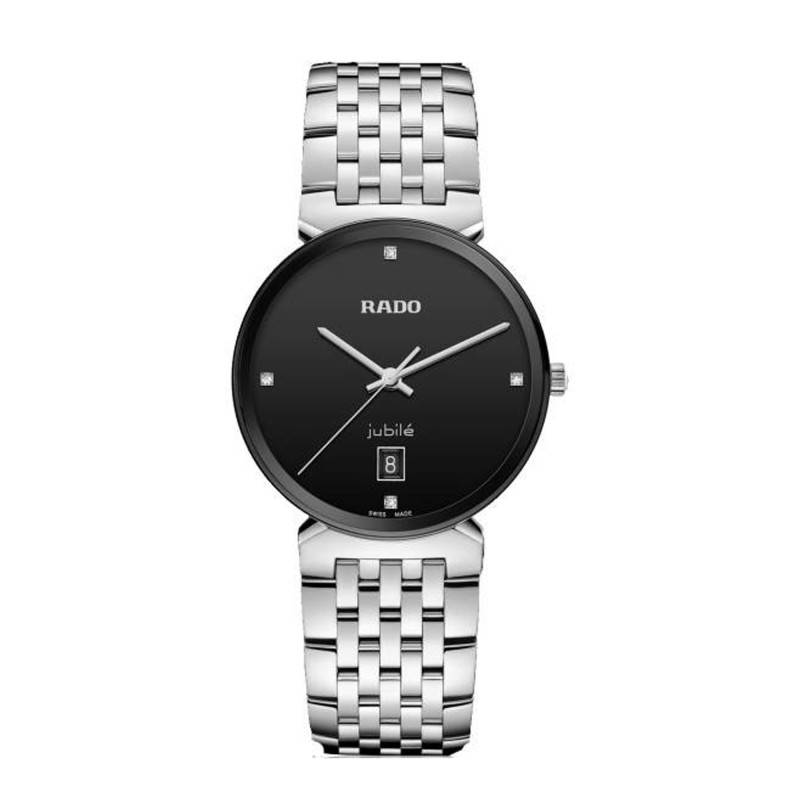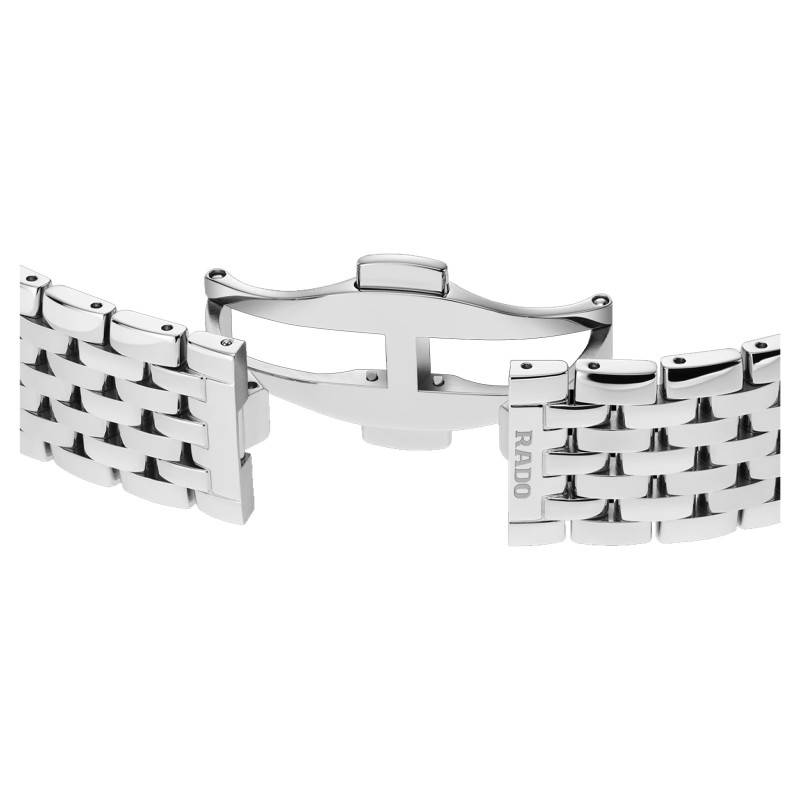 Cette ravissante montre accueille un cadran rond qui s'impose par son élégance et son charme absolu. Habillé d'un magnifique ton noir, il est sublimé par une finition mat qui offre un beau contraste. Les aiguilles des heures et des minutes se parent d'une teinte grise assortie à la trotteuse des secondes. Elles pointent vers douze diamants étincelants qui ajoutent une touche de luxe à l'ensemble. Le guichet à 6 heures vous communiquera la date du jour. Pour finir, Rado appose son nom à 12 heures et fait de ce modèle, un accessoire idéale pour les occasions spéciales.