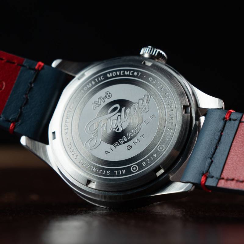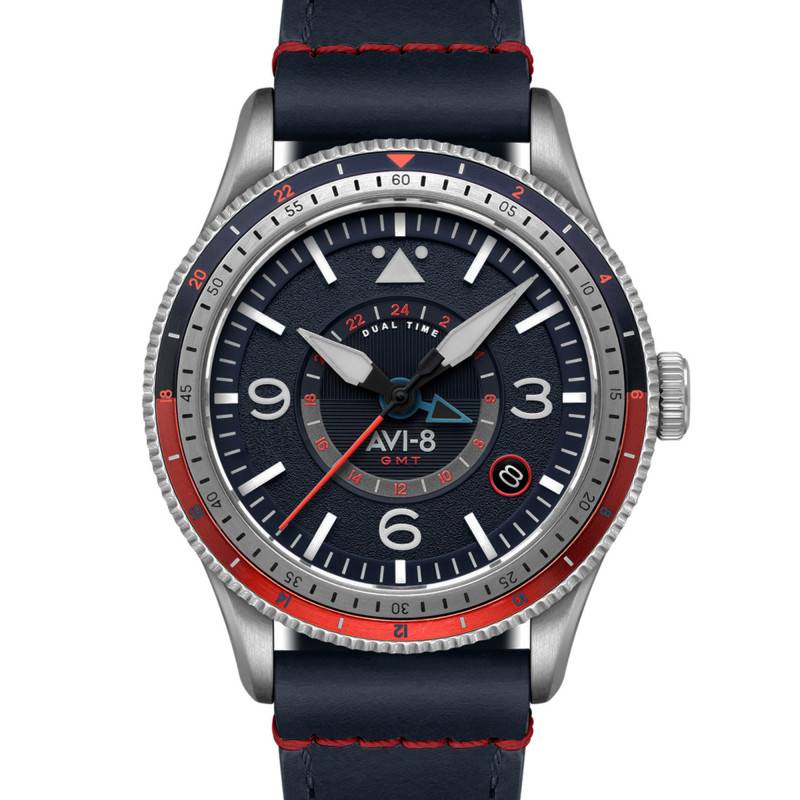 La montre Flyboy Airmaster GMT Automatique d'Avi-8 incarne une allure résolument moderne et sportive. Elle associe une esthétique audacieuse aux fonctions avancées, destinées au voyageur d'aujourd'hui. Son boîtier rond de 40 mm est fabriqué en acier inoxydable, offrant une robustesse et une résistance exceptionnelles. Avec une épaisseur de 15 mm, le boîtier abrite un mouvement automatique de précision venant du Japon. La montre est conçue pour capter l'œil immédiatement avec ses contrastes de bleu et rouge, annonçant d'emblée son caractère dynamique et affirmé. Ce modèle magistral protège son cadran par un verre saphir traité antireflet, une composition hautement résistante qui promet une clarté incomparable à toute épreuve.