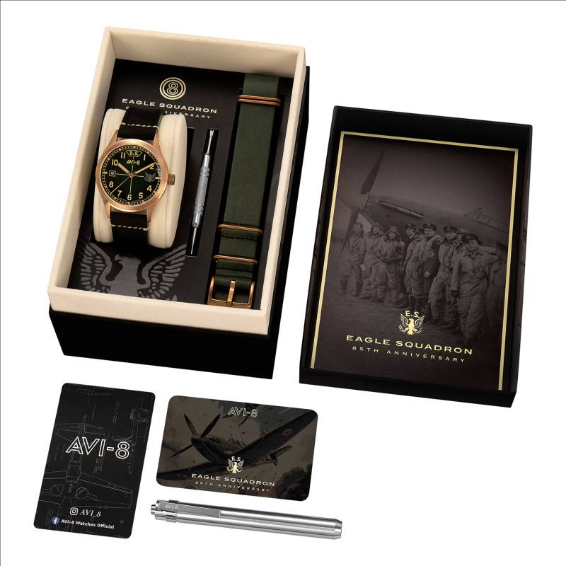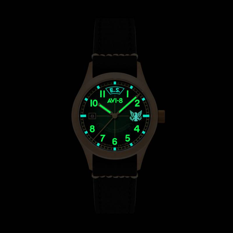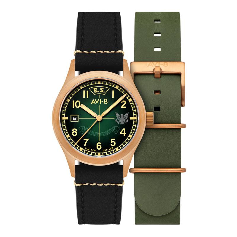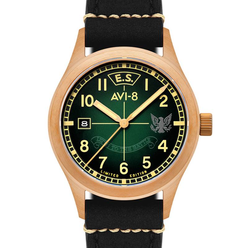 La Montre Flyboy Eagle Squadron Automatic Bronze 85Th Limited Edition Coltishall de la marque Avi-8 incarne l'élégance masculine avec son boîtier rond en bronze aux finitions mat (brossée/satinée). Avec un diamètre de 39 mm et une épaisseur de 15 mm, elle offre une présence remarquable au poignet sans être trop imposante. Cette montre est limitée à 175 exemplaires, accentuant son caractère de collection. Le verre est en saphir avec un traitement antireflet pour garantir une lisibilité optimale et une protection contre les rayures. Le fond de boîte transparent et vissé permet d'admirer le mécanisme interne, ajoutant une dimension d'exclusivité et de raffinement.