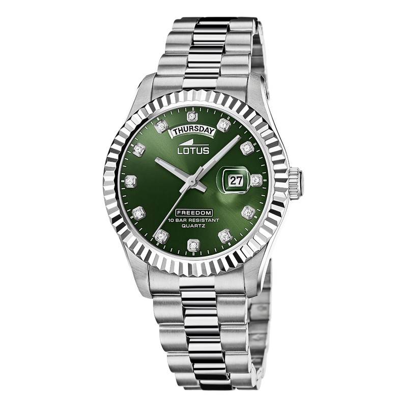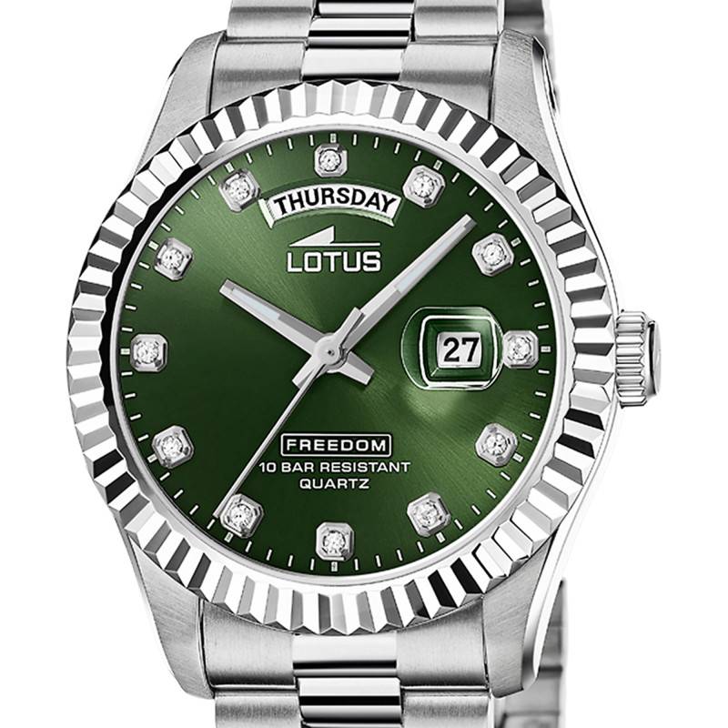 Lotus propose depuis plus de 40 ans maintenant de belles montres de qualité accessibles. Dans la collection Freedom, elle vous présente cette magnifique montre Freedom Green conçue pour la gent masculine. Avec cette montre, vous pourrez renouveler votre style avec classe. Elle possède un boîtier argenté en acier inoxydable 316 L de 41.5 millimètres de diamètre et 10.55 millimètres d'épaisseur. Sur ce boîtier est installée une lunette cannelée argentée qui vient parfaire l'esthétique de ce garde-temps. Il est surplombé par un verre minéral plat qui résiste aux chocs légers du quotidien. Une couronne crantée est installée à 3 heures pour le réglage de l'heure. Le fond de boîte vissé de cette montre lui assure une étanchéité de 10 ATM.
