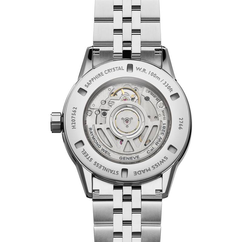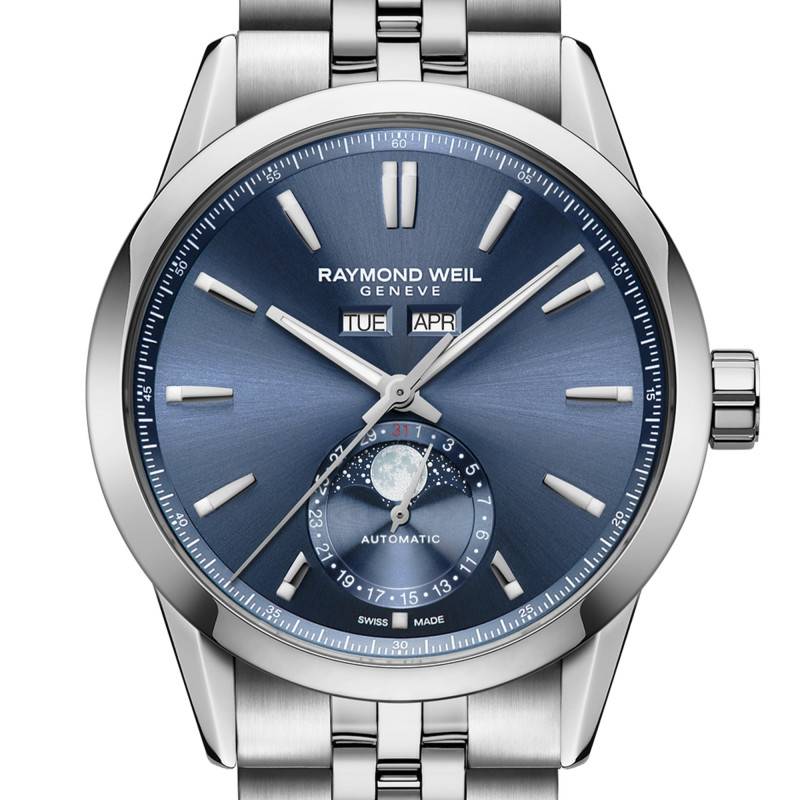 La montre Raymond Weil Freelancer Complete Calendar incarne à la perfection l'élégance et la sophistication intemporelle associées aux montres suisses. Le boîtier de 40 mm est finement conçu en acier inoxydable, garantissant non seulement une robustesse à toute épreuve mais aussi une allure éclatante grâce à sa finition polie et brillante. Sa forme ronde classique laisse deviner une horlogerie de grande tradition, enrichie par un fond transparent vissé qui permet d'admirer le mouvement attentivement mis en scène. Le verre en saphir plat, traité avec un double revêtement antireflets, confère non seulement une protection exceptionnelle mais aussi une lisibilité parfaite.