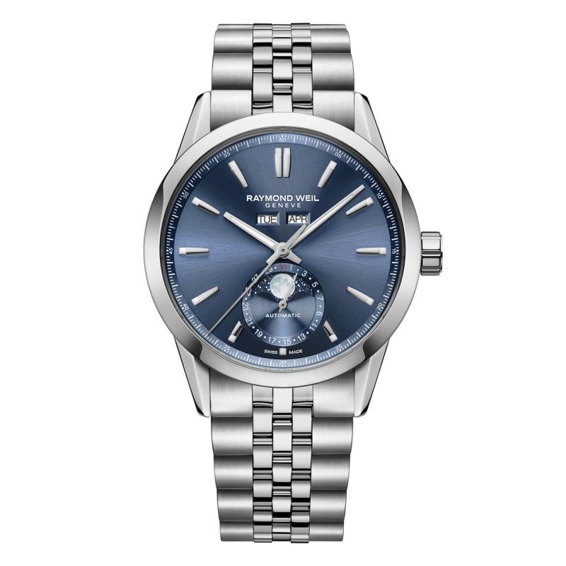 Le cadran de cette montre Raymond Weil se distingue par sa finition bleue soleillée. Ce traitement esthétique crée des reflets lumineux captivants évoquant les rayons du soleil, soulignant ainsi la profondeur et la richesse de la teinte du cadran. Les aiguilles centrales, de type dauphine, sont luminescentes, tout comme les index, grâce au traitement SuperLuminova, ce qui garantit une visibilité optimale quelle que soit la lumière ambiante. Les chiffres arabes utilisés sont disposés de manière à ne jamais compromettre la lisibilité du temps. De plus, le cadran intègre un calendrier complet affichant le jour et le mois grâce à des guichets discrets mais sophistiqués. Un compteur supplémentaire loge discrètement la phase de lune, ajoutant une touche romantique et fonctionnelle. Le chemin de fer des minutes guide le regard et facilite la lecture des minutes et des secondes, apportant une précision certaine à chaque coup d'œil sur le cadran.