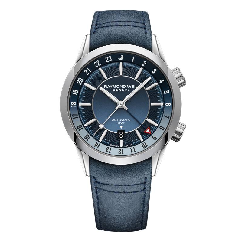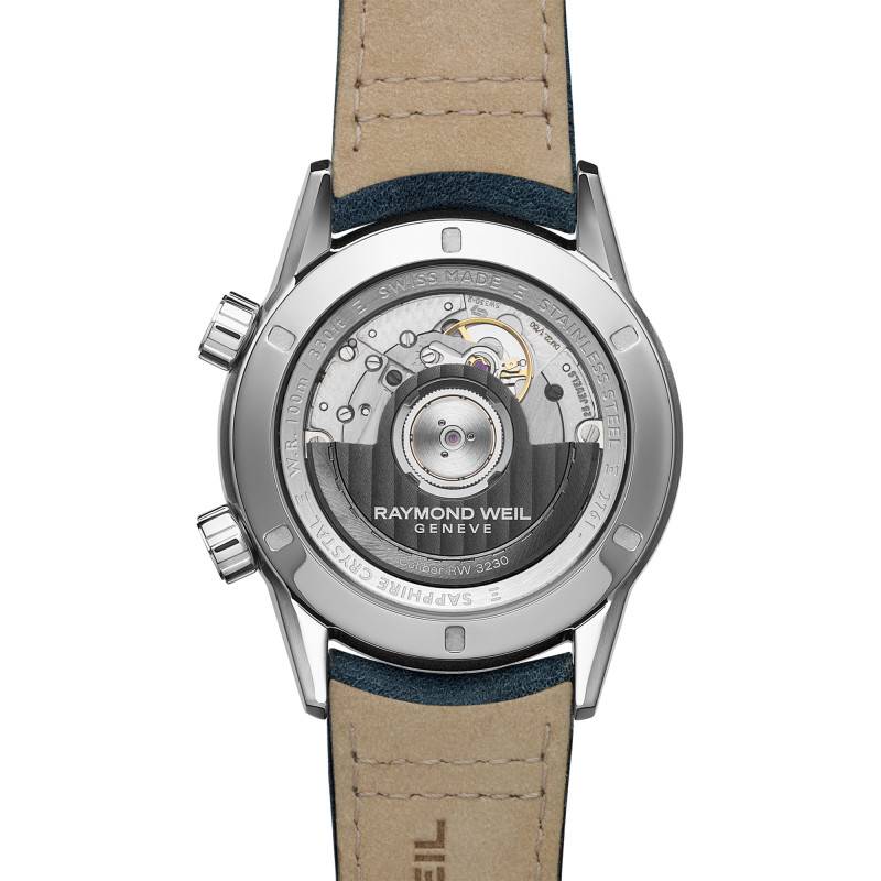 La montre abrite un calibre automatique suisse RW3230, développé par Raymond Weil. Ce mouvement est reconnu pour sa fiabilité et sa précision inégalées, offrant une réserve de marche de 56 heures. Grâce à sa masse oscillante, le mouvement s'auto entretient lorsque la montre est portée, assurant un fonctionnement continu et harmonieux. Le calibre RW3230 permet des fonctions sophistiquées telles que l'affichage des heures, minutes, secondes, ainsi que la lecture de la date et la gestion d'un second fuseau horaire via la fonction GMT. Cela positionne ce garde-temps comme un compagnon idéal pour les voyageurs avertis.