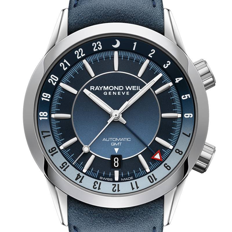 Le cadran de la montre Freelancer GMT de Raymond Weil est un véritable chef-d'œuvre d'horlogerie, avec sa finition dégradée en bleu qui évoque des profondeurs marines aux nuances subtiles. La disposition des chiffres arabes et des index avec chemin de fer des minutes marquent clairement chaque heure, facilitant une lecture immédiate et précise du temps. Les aiguilles et index luminescents, traités avec SuperLuminova, assurent une visibilité parfaite même dans des conditions de faible éclairage. Ce cadran intègre également un guichet date, positionné à une heure stratégique pour un accès visuel rapide. L'indicateur jour/nuit offre une dimension supplémentaire, permettant de garder une perspective globalisée du temps, une fonctionnalité essentielle pour les amateurs de complications horlogères.