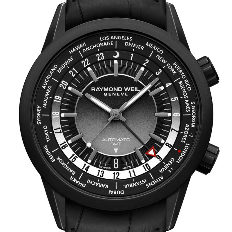 Au cœur de cette montre bat un mouvement automatique RW3230, un symbole de précision et de fiabilité suisse. Ce calibre, conçu par Raymond Weil, garantit une haute performance avec une réserve de marche généreuse de 56 heures. Les fonctions incluent un affichage des heures, minutes, secondes, une fonctionnalité GMT pour suivre un second fuseau horaire et un indicateur jour/nuit, répondant ainsi aux besoins des voyageurs avertis. Le mouvement est visible à travers le fond transparent, une invitation à admirer l'artisanat complexe de la montre.