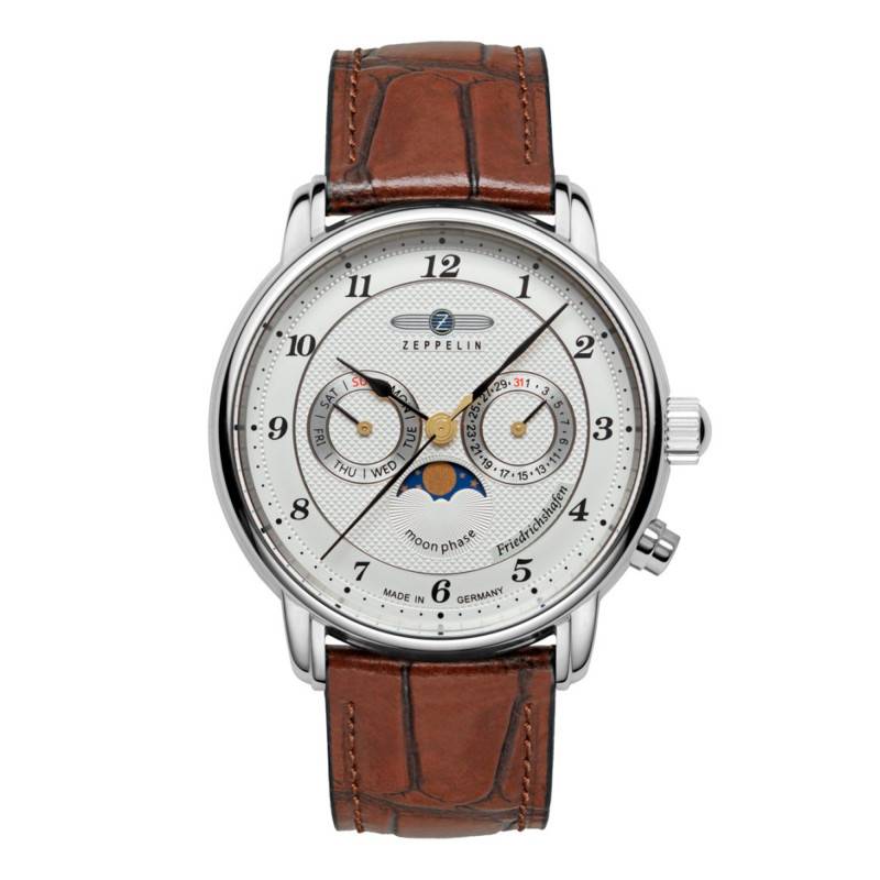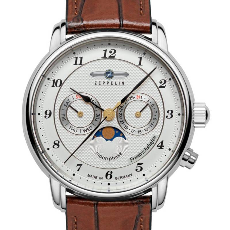 Zeppelin est une marque horlogère allemande qui se distingue grâce à ses designs classiques et modernes. Elle propose des montres raffinées qui, intégrant des détails élégants, sont fabriquées à partir de matières de première qualité. En combinant son esprit créatif à ses compétences de fabrication poussées, elle continue de se faire une place de choix sur le marché avec des créations uniques et novatrices qui répondront à vos attentes. Elle vous propose aujourd'hui la montre Friedrichshafen Moon Phase 8536-1. Ce modèle s'adapte à tous les styles et saura faire la distinction sur les poignets des hommes. Son boîtier rond en acier inoxydable gris se pare d'une finition polie, lui conférant une allure éclatante. D'un diamètre de 40 mm et d'une épaisseur de 11 mm, il est rehaussé par un verre minéral K1 protégeant le cadran contre les chocs. À 3 et 4 heures, une couronne et un bouton-poussoir sont disposés, facilitant le réglage des aiguilles ainsi que des compteurs. Enfin, le fond emboîté de ce garde-temps garantit une étanchéité de 5 ATM.