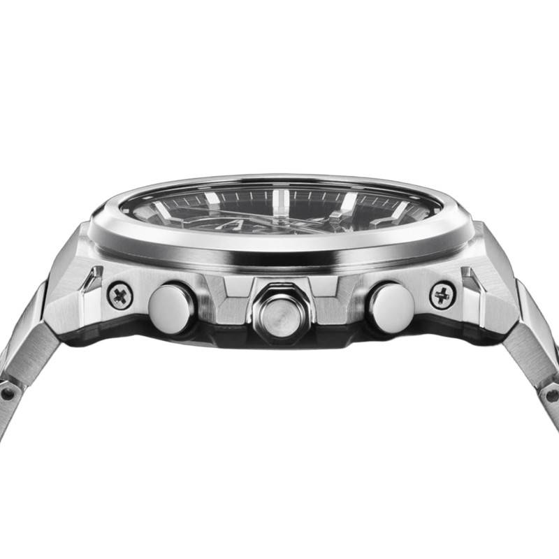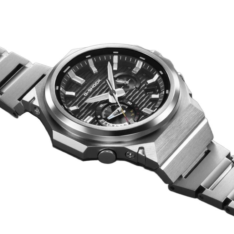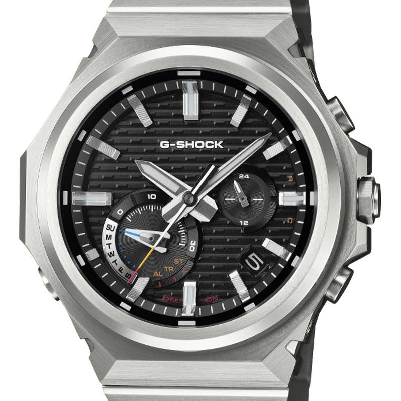 Le cadran de la G-Shock G-Steel est là où l'élégance moderne rencontre la fonctionnalité avancée. Arborant une couleur noire raffinée, il met en valeur une finition guillochée et texturée qui ajoute une profondeur visuelle significative. Ce cadran est doté de plusieurs fonctions, incluant un calendrier perpétuel, un affichage analogique avec des aiguilles et des index dotés de technologie Neobrite, garantissant leur luminescence dans l'obscurité. En plus, le Super Illuminator LED assure que l'affichage soit toujours visible, même dans les conditions les moins favorables. Grâce à ses compteurs additionnels proposant une mesure 24 h et 30 min, et un chronomètre au 1/1e de seconde, ce cadran n'est pas seulement fonctionnel, mais un chef-d'œuvre de précision affichant des heures, minutes, secondes, ainsi que la date.