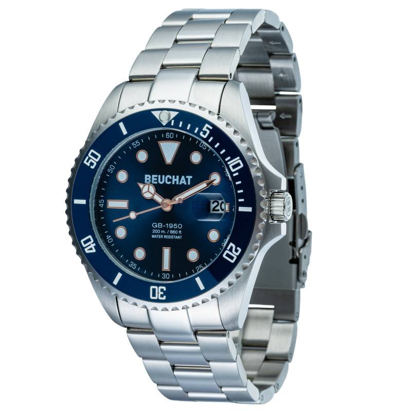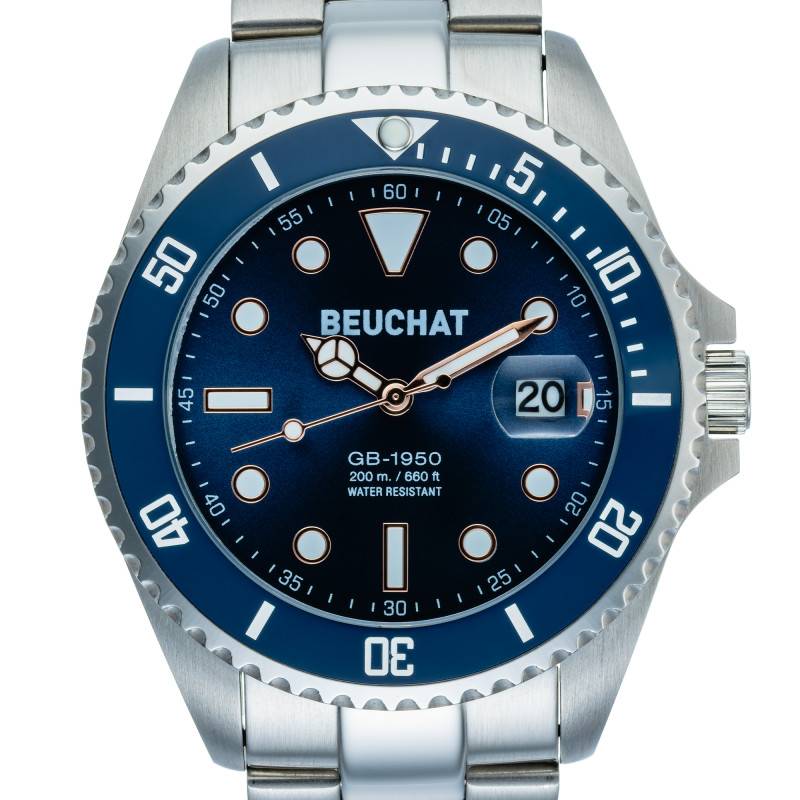Ce garde-temps de la marque Beuchat, modèle GB1950, incarne la robustesse et l'élégance. Dotée d'un boîtier rond en acier inoxydable, sa finition mate brossée et polie lui confère une apparence sophistiquée et moderne. Avec un diamètre imposant de 44 mm et une épaisseur de 12 mm, cette montre affirme une présence notable à votre poignet. Le fond du boîtier est vissé, garantissant une protection accrue contre l'immersion et renforçant son étanchéité exceptionnelle. La couronne située à droite permet un ajustement aisé du temps.