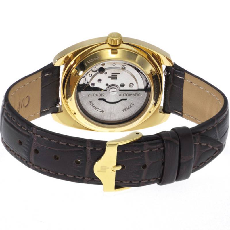 Le bracelet en cuir de vachette est d'une élégance discrète, doté d'un motif alligator qui ajoute une texture et un caractère distinctif. De couleur marron, il s'harmonise parfaitement avec la teinte dorée du boîtier, créant une cohésion visuelle. Les surpiqûres minutieuses soulignent le soin apporté à chaque détail, offrant une dimension artisanale indéniable. Sa boucle ardillon classique permet un ajustement personnalisé et sécurisé, garantissant un port confortable et élégant en toute circonstance. La largeur de 18 mm assure un maintien solide et stable sur le poignet.