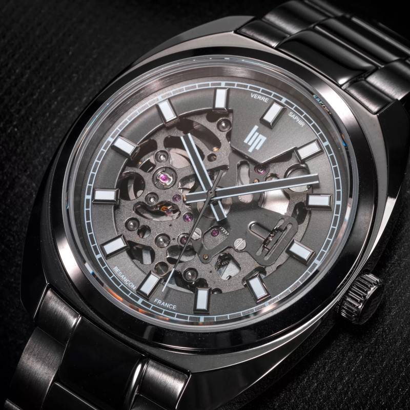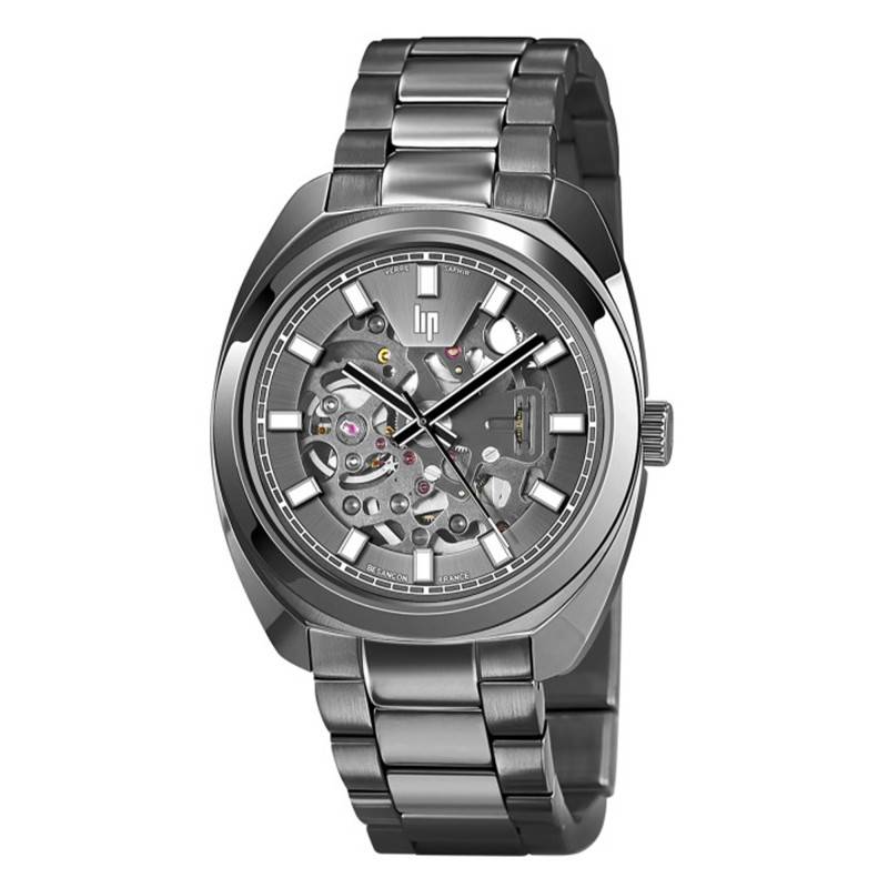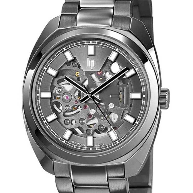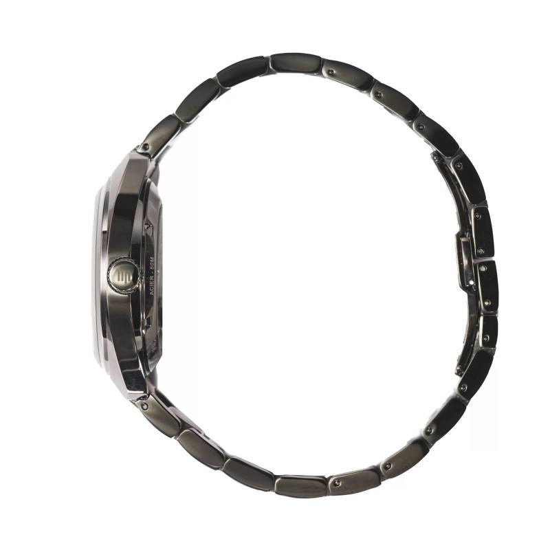 Lip revisite son modèle emblématique du Général de Gaulle. La maison française met en valeur ce modèle en mettant en avant son mouvement automatique. Les amateurs d'horlogerie seront séduits. Son boîtier en acier inoxydable rond dispose d'un diamètre de 39 mm. La carrure de votre garde-temps se pare d'un gris/noir IPGUN, tandis que sa lunette se pare de nuances de noires. Sa finition mate, ajoute une touche d'élégance. Sa couronne remontoir située à 3 h, vous permettra de régler votre garde-temps au gré de vos déplacements ou voyages par exemple. Un verre saphir vient surmonter votre boîtier en acier afin de protéger ce dernier des éventuels chocs que vous pourriez subir malencontreusement. Votre fond de boîte est quant à lui vissé et transparent, vous laissant le plaisir de contempler votre mécanisme et d'admirer la danse de votre masse oscillante. Votre pièce horlogère dispose d'une étanchéité de 5 ATM, de quoi vous accompagner au quotidien !