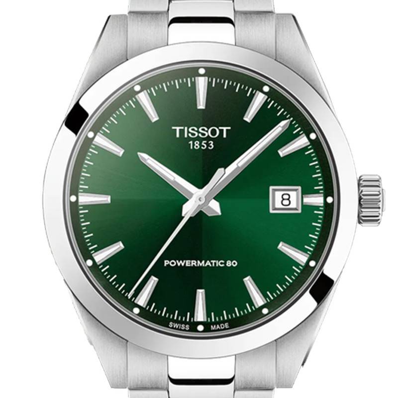 Le cadran de cette Tissot est un véritable enchantement visuel avec sa finition soleillée vert qui capte élégamment la lumière. La disposition classique des éléments, à savoir le guichet de date situé à 3 heures, s'accompagne de détails sophistiqués tels que les aiguilles et les index luminescents assurant une lisibilité parfaite dans toutes les conditions. La simplicité et l'élégance de ce cadran sont renforcées par le verre plat en saphir qui, au-delà de son rôle protecteur, met en valeur les couleurs et finitions du cadran. Ce cadran est une démonstration parfaite de l'équilibre entre fonction et esthétique, propre aux montres de qualité suisse.