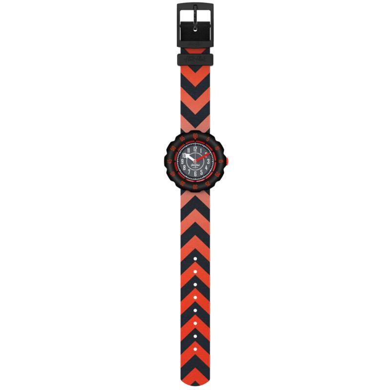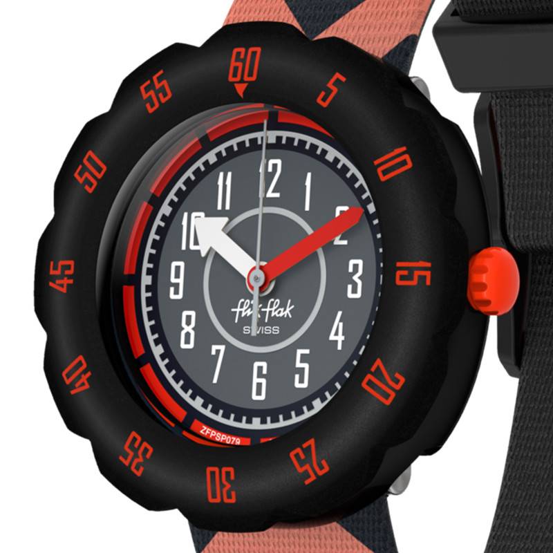 Le cadran de la montre Flik Flak Get Set Go ! est conçu pour une lisibilité maximale, essentielle pour l'apprentissage de l'heure par les enfants. Sa finition mate réduit les reflets, permettant une lecture rapide et facile en toutes circonstances. Les chiffres arabes en blanc tranchent distinctement sur le fond noir, aidés par des index et un chemin de fer des minutes pour guider les yeux sur les graduations exactes des minutes. Les aiguilles des heures, des minutes et des secondes sont suffisamment grandes et de couleurs vives pour divertir et intéresser les petits utilisateurs.