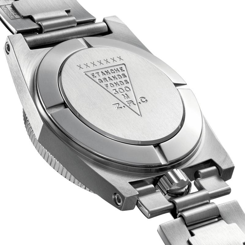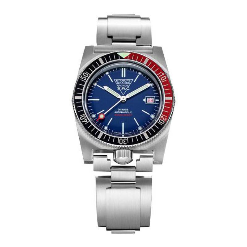Née à Genève sous la direction d'Edmond Zuccolo et Joseph, la maison ZRC s'est fait connaître dans les années 1950 avec sa première montre de plongée, la ZRC Grands Fonds 300. Développée avec l'aide de plongeurs d'Annecy, ce garde-temps a véritablement révolutionné le monde de la plongée. Des variantes ultérieures de ce modèle ont été utilisées pour de nombreuses créations. Il s'agit donc d'une montre avec une véritable histoire horlogère qui a su parer les poignets des plus courageux. Pour célébrer ce glorieux héritage, la Maison a créé le modèle le plus proche de la version originale des années 1960. Ce modèle GF38293 arbore un boîtier monobloc de 39 mm de diamètre conçu en acier inoxydable 316 L disposant d'une finition satinée. Certifié ISO764, il sera résistant à la pression et aux champs magnétiques. Par ailleurs, sa surface se pare d'une lunette tournante unidirectionnelle à 60 clics avec un insert en aluminium gravé par un chemin de fer des minutes. Elle vous permettra de chronométrer le temps écoulé lors de la plongée. Ses teintes noire et rouge rehaussent magnifiquement l'allure générale du boîtier. Son cadran est recouvert d'un résistant verre saphir bombé antireflet qui a été placé afin de le protéger des éventuels chocs du quotidien et assurer une lisibilité optimale. L'une des caractéristiques qui rend cette montre presque unique est bien sûr la couronne vissée gravée du logo de la maison et positionnée à 6 heures. Celle-ci vous aidera pour vos mises à l'heure. Enfin, le fond de boîte vissé et gravé de la boîte assure une résistance à l'eau allant jusqu'à 300 mètres.