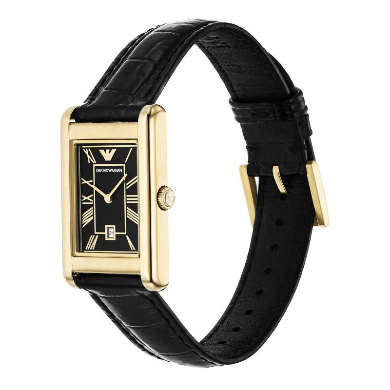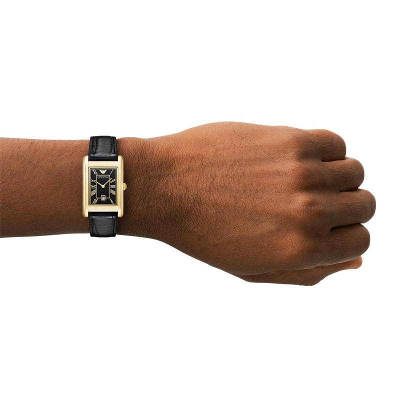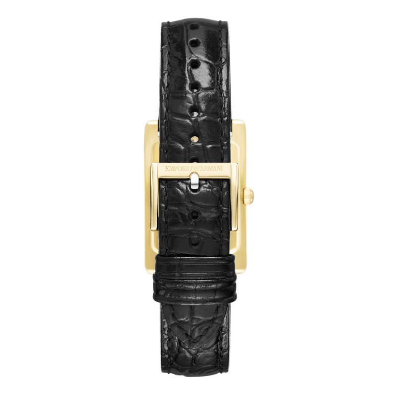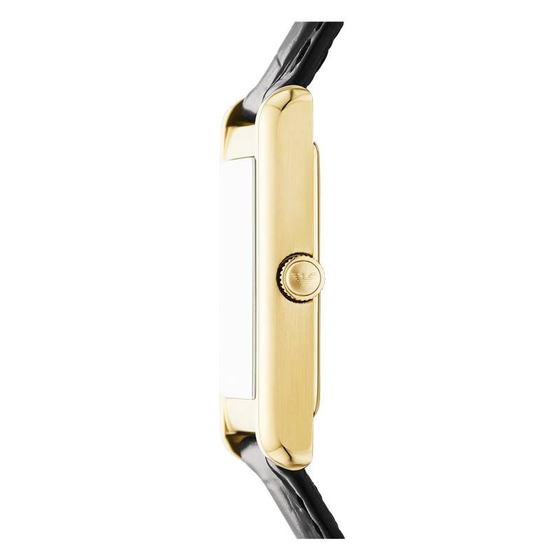 La montre Gino par Emporio Armani se distingue par ses lignes raffinées et son allure moderne. Le boîtier rectangulaire, mesurant 28 mm de longueur pour 25 mm de largeur, est fabriqué en acier inoxydable de qualité supérieure, revêtu d'une finition PVD jaune élégante, qui confère une brillance remarquable à l'ensemble de la pièce. Le fond de boîte est discrètement emboîté, garantissant l’étanchéité à 5 ATM, ce qui assure une protection optimale contre l’eau pour les activités quotidiennes.