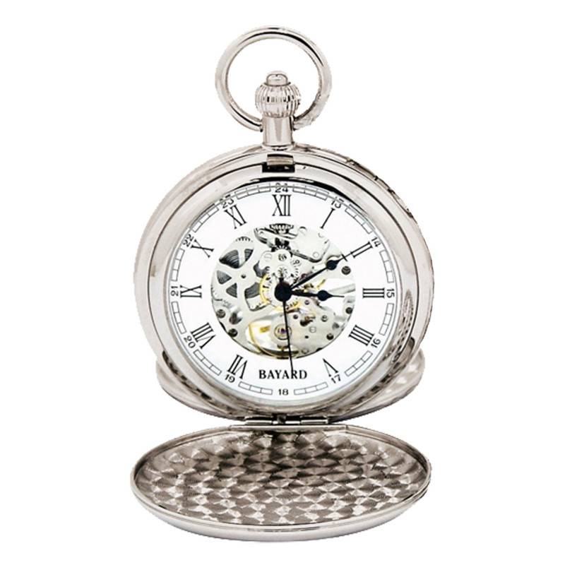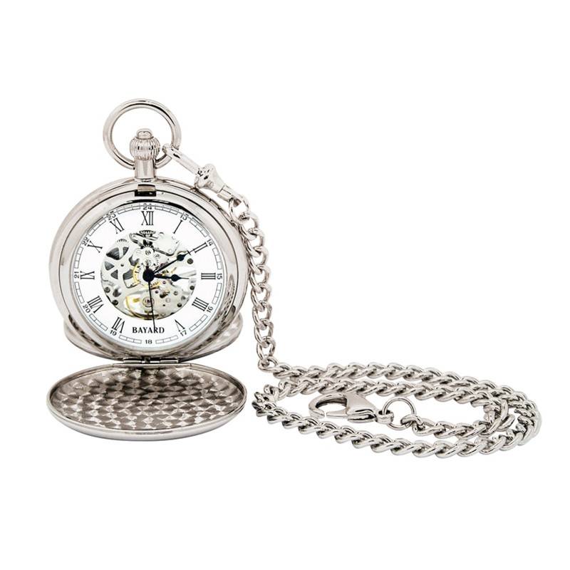 Bayard est une marque d'horlogerie française qui propose un large choix de garde-temps avec des designs classiques, intemporels et élégants. Parmi ses créations, il y a également des montres de gousset, dont ce modèle TP22.2. C'est un véritable classique avec un boîtier rond en laiton argenté affichant une finition polie. Celui-ci comporte un verre acrylique qui couvre le cadran et mesure 50 mm de diamètre pour 19,10 mm d'épaisseur. Il dispose de deux clapets qui protègent le cadran et le fond transparent. Ceux-ci arborent un bel aspect perlé qui offre une touche de sophistication à la montre. À 12 heures, se trouve une couronne entourée par un anneau qui assure le réglage des heures et des minutes.