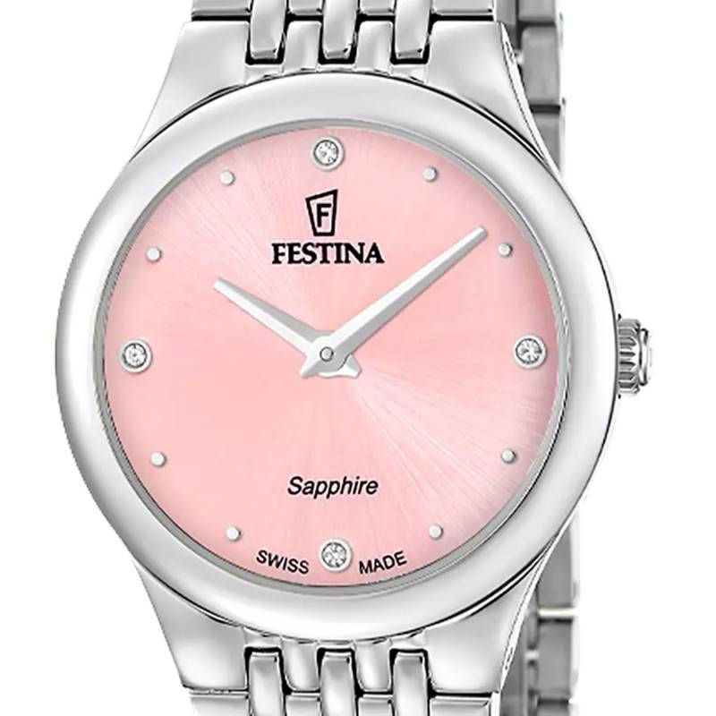 La montre de la prestigieuse marque Festina Swiss Made incarne raffinement et excellence horlogère. Son boîtier rond de 29 mm de diamètre est parfaitement conçu pour épouser délicatement le poignet féminin. Fabriqué en acier inoxydable, il présente une finition polie qui attire la lumière, rehaussant son allure contemporaine et élégante. Avec une épaisseur de 6,50 mm, ce garde-temps arbore un profil fin et féminin. La lunette, intégrée et raffinée, partage la même finition brillante. Le fond de boîte emboité garantit une construction homogène et sécurisée, protégeant les composants internes avec efficacité. Le verre saphir, reconnu pour sa résistance exceptionnelle aux rayures, est une assurance de longévité pour l'élégant cadran qu'il protège. Le poids total de 58 g assure un port confortable, quasi imperceptible, parfait pour une utilisation quotidienne.