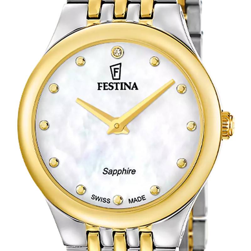 Le cadran de la montre Festina se démarque par sa finition nacrée et soleillée, offrant un jeu de lumière subtil qui attire l'œil à chaque mouvement du poignet. La surface nacrée reflète de magnifiques nuances, rehaussant son allure sophistiquée et distinguée. Les index en mix d'acier et oxyde de zirconium, soigneusement positionnés, ajoutent une dimension luxueuse et un éclat remarquable qui évoque la haute joaillerie. De plus, la précision du cadran est protégée par un verre saphir plat, et renforce le caractère durable et haut de gamme de cette pièce. L'affichage analogique avec ses aiguilles fines assure une lecture claire et précise des heures et des minutes, conférant à la montre une lisibilité exceptionnelle en toutes circonstances. Le bouton remontoir unique permet un réglage simple et élégant, en parfait accord avec l'esthétique raffinée du cadran.
