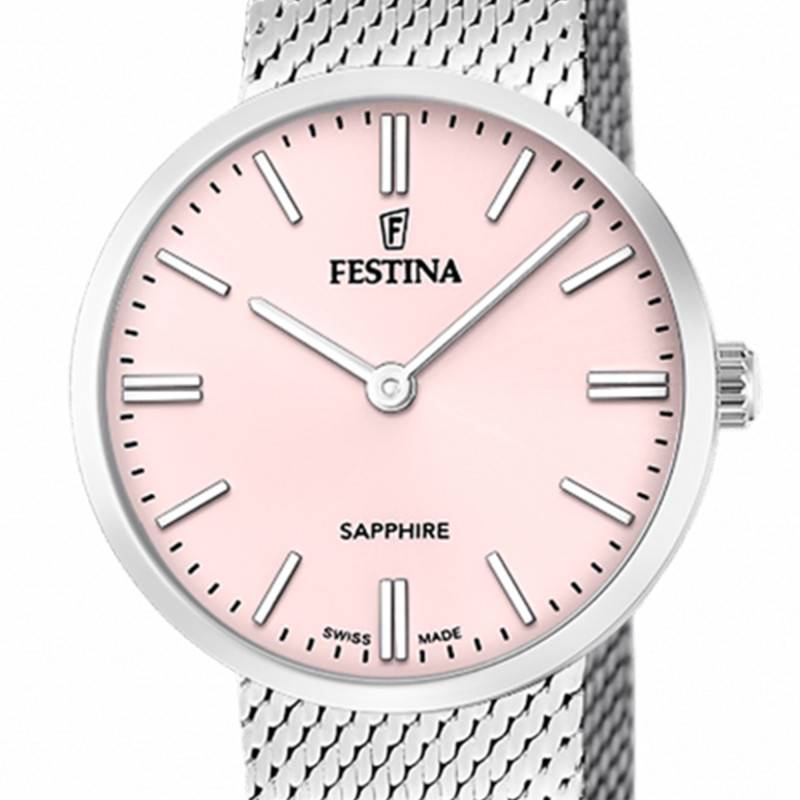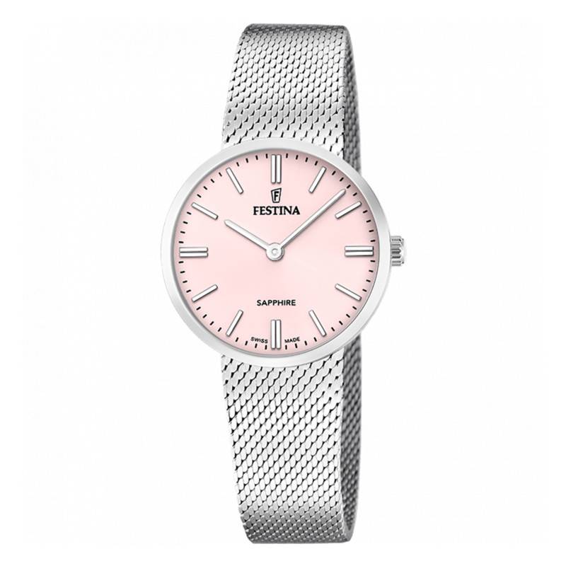 La montre pour femme Festina Swiss Made incarne une élégance subtile avec son boîtier rond en acier inoxydable 316L, mesurant 29,30 mm de diamètre. La finition polie et brillante de l'acier offre un éclat qui attire le regard. Le design est avant tout minimaliste et moderne, mettant en lumière le savoir-faire suisse. Un unique bouton remontoir est discrètement positionné sur le côté, soulignant l'esthétique épurée et les lignes délicates de cette pièce horlogère.