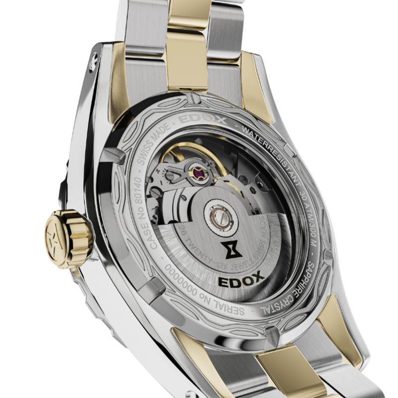 La montre Edox Grand Ocean Automatic se distingue par la sophistication de son design et la précision horlogère suisse. Ce garde-temps pour femme allie avec raffinement l'acier inoxydable et le PVD jaune pour un style élégant et contemporain. Le boîtier rond, mesurant un diamètre de 40 mm avec une épaisseur de 11,90 mm, confère à la montre une présence affirmée au poignet, tout en garantissant un confort optimal grâce à son poids de 155 grammes. Le verre utilisé est un saphir, garantissant clarté et durabilité. Grâce à sa couronne vissée, cette montre assure une étanchéité de 30 ATM, idéale pour les activités nautiques. Le fond de la boîte est transparent et vissé, permettant de contempler la masse oscillante du mouvement automatique.