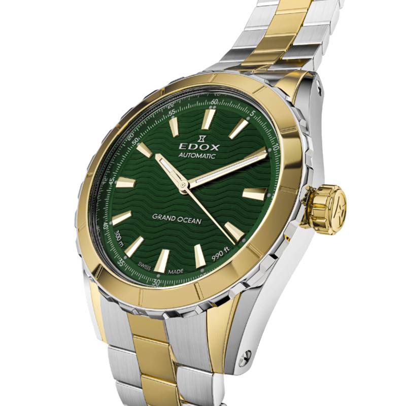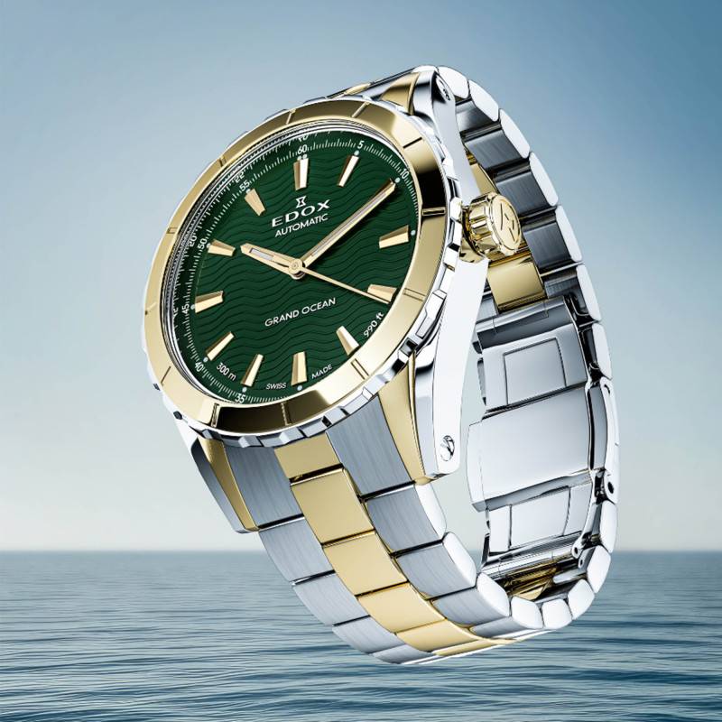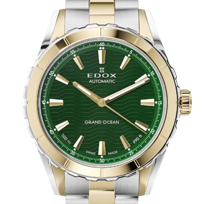 Le cadran de cette spectaculaire Edox est d'un vert profond, conférant une allure luxueuse et moderne. Sa finition mate assure une lisibilité parfaite en tout temps. Les aiguilles délicates revêtues de SuperLuminova s'illuminent dans l'obscurité, permettant une lecture optimisée de l'heure. Les index luminescents sont alignés avec précision autour du cadran, tandis que le chemin de fer minutieusement gravé accentue la précision du temps. Le nom de la marque et de la collection "Grand Ocean" est inscrit avec élégance, soulignant l'authenticité de ce garde-temps suisse. Ce cadran capture non seulement l'heure, les minutes et les secondes, mais il saisit aussi une beauté intemporelle.