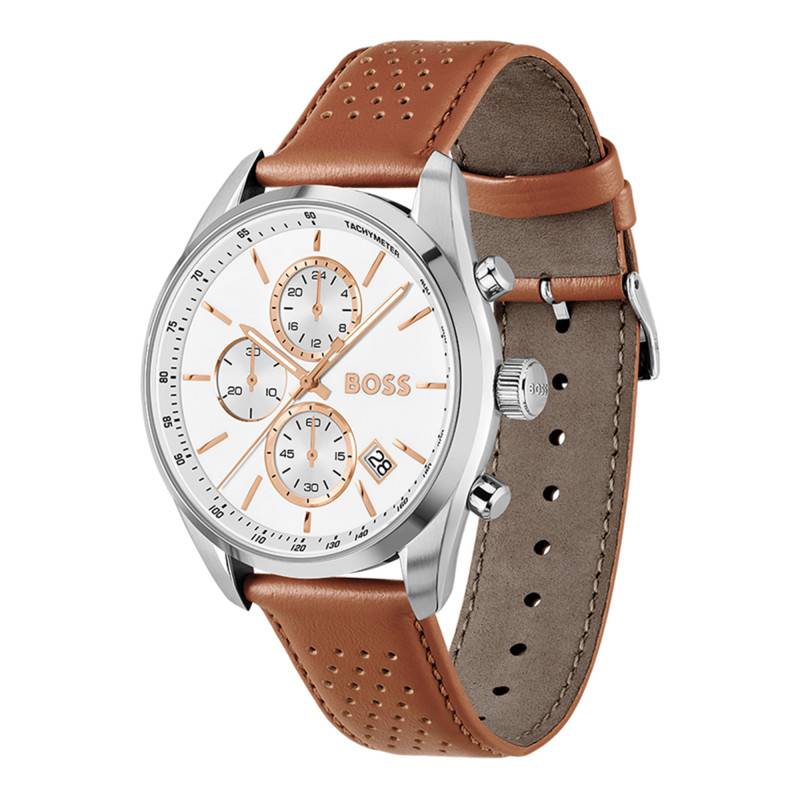 Le bracelet en cuir de bovin perforé de couleur marron accentue le look sportif tout en offrant un confort optimal. Les surpiqûres apparentes ajoutent du relief et soulignent l’artisanat du cuir. La boucle ardillon confère une fermeture fiable et sécurisée, complétant ainsi le design harmonieux de la montre.