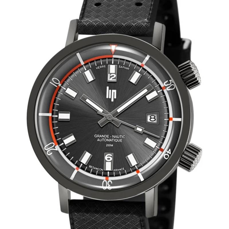 Lip vous présente le modèle Grande Nautic-Ski Automatique qui allie un design sophistiqué et de haute qualité. Les passionnés de l'horlogerie seront séduits par ce modèle puisqu'il laisse entrevoir les rouages du mouvement à l'arrière du boîtier. Cette montre présente un boîtier de forme ronde en PVD noir avec diamètre de 41 millimètres et une épaisseur de 15 millimètres. Ces dimensions s'adapteront parfaitement aux poignets masculins et procureront un agréable confort durant votre journée. De plus, le cadran sera protéger des rayures et des chocs par un verre saphir. Iconique, ce garde-temps est muni de deux couronnes vissées situées à deux heures et quatre heures. Elles vous aideront à régler quand vous le souhaitez les heures, les minutes ainsi que la date. Enfin, son fond de boîte sera vissé et vous laissera admirer le mécanisme de la montre grâce à sa transparence. Il vous garantira également une étanchéité de 20 atmosphères.