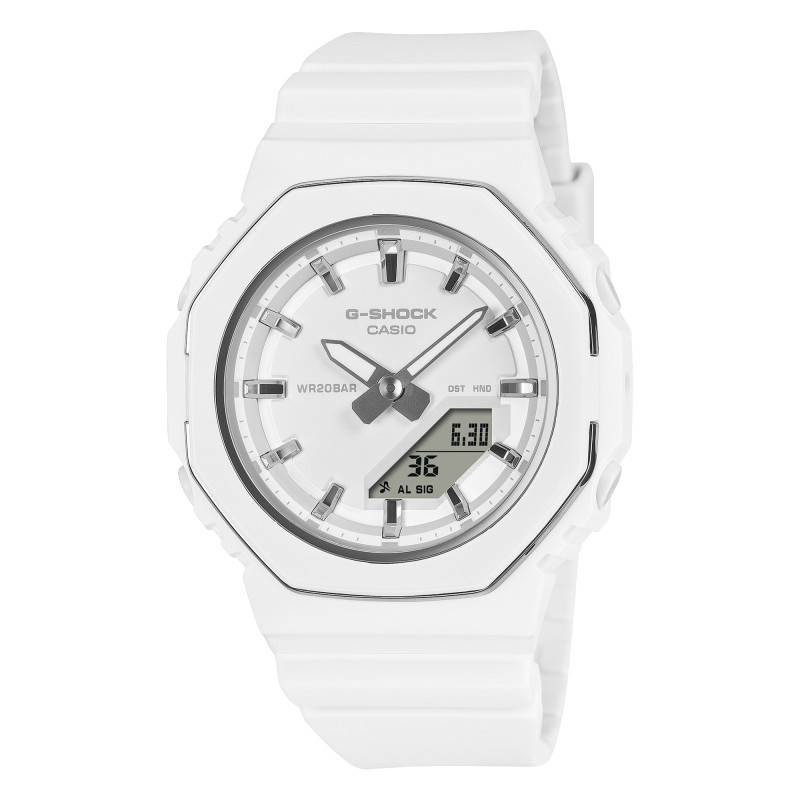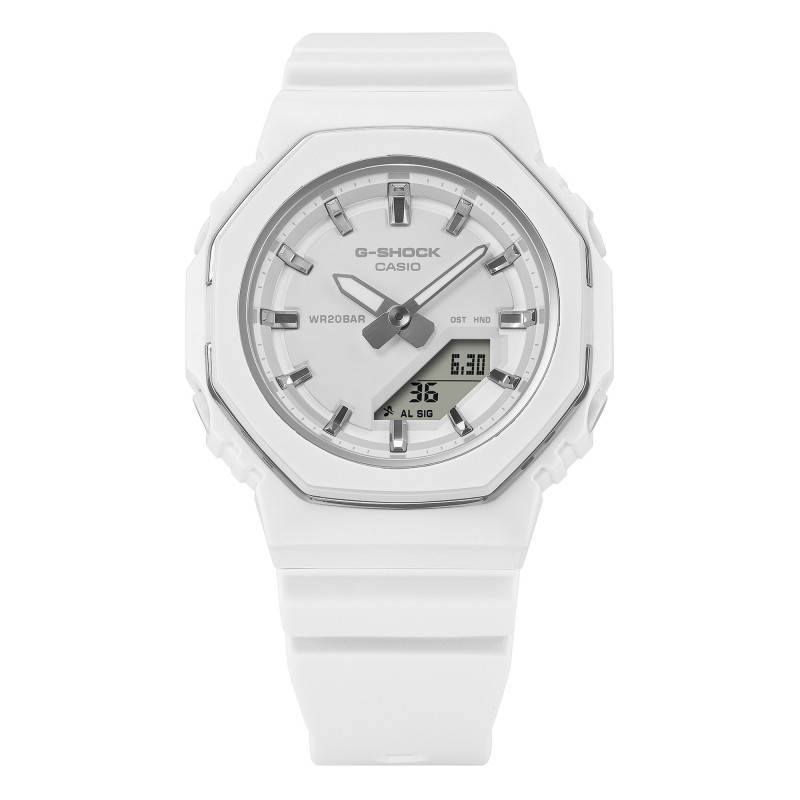 La montre Casio G-Shock se distingue par son design moderne et audacieux, caractérisé par une forme octogonale distincte et une couleur blanche éclatante. Le boîtier léger de 37 grammes en résine biosourcée présente une finition mate, offrant à la montre une allure à la fois dynamique et élégante. Conçue pour résister aux conditions les plus éprouvantes, la montre bénéficie d'une solidité exemplaire grâce à des matériaux de haute qualité comme le verre minéral plat. Des éléments de métal, notamment la bague de lunette traitée par dépôt en phase vapeur, ajoutent une subtile touche d'élégance tout en capturant harmonieusement la lumière. Le fond de la boîte est solidement maintenu par des vis, renforçant ainsi la durabilité et l'étanchéité exceptionnelle de ce modèle qui figure parmi les références en matière de montres de sport et d'activités extrêmes.