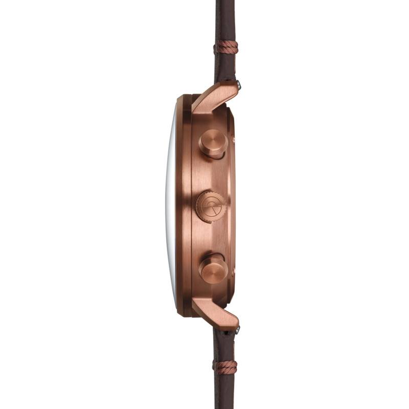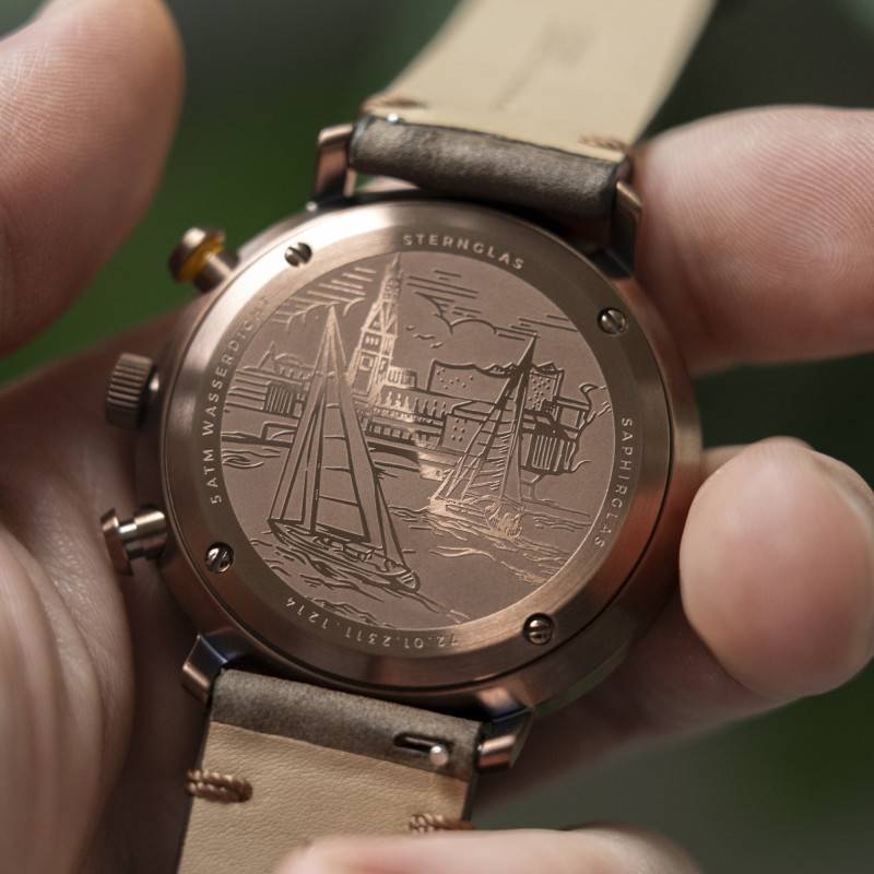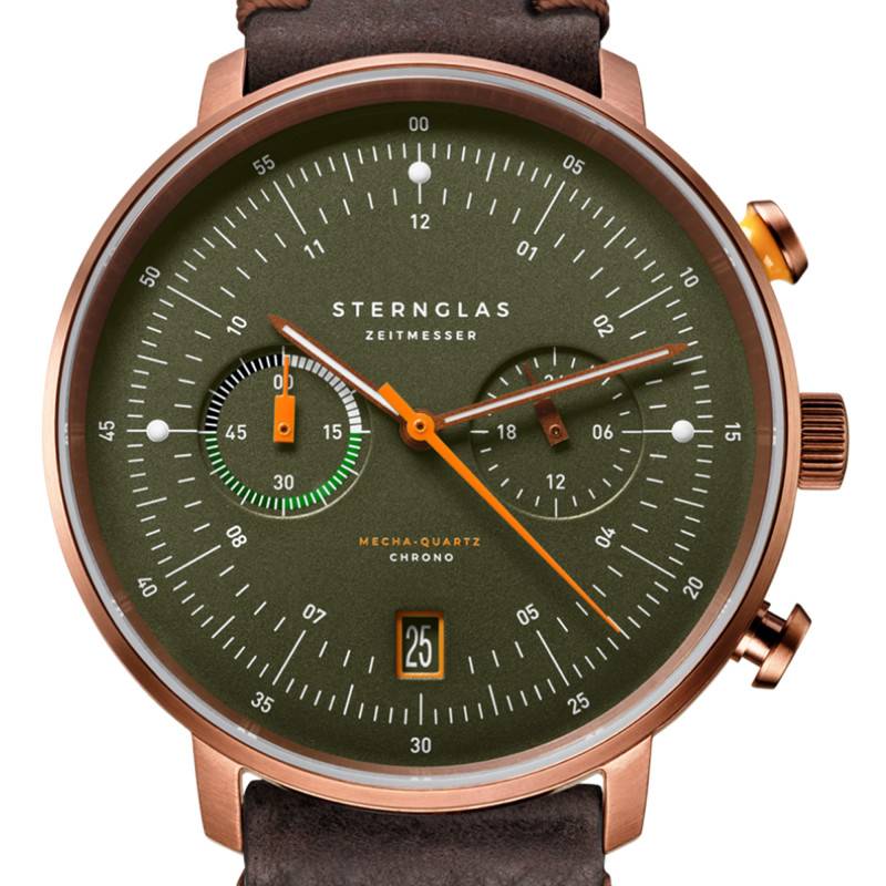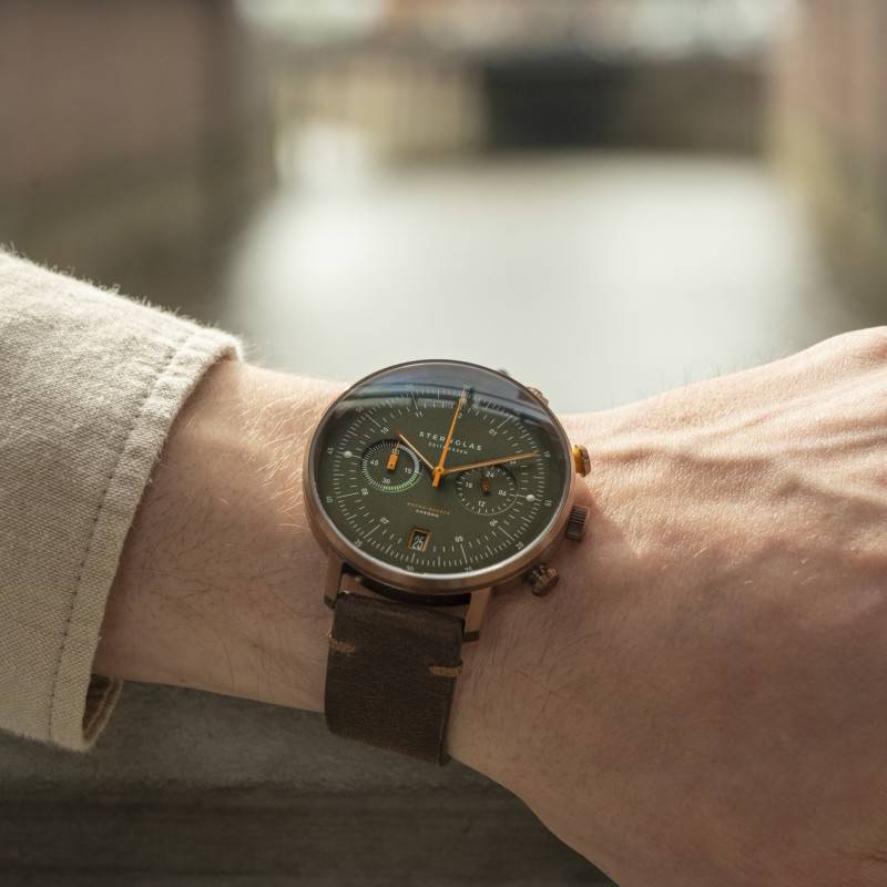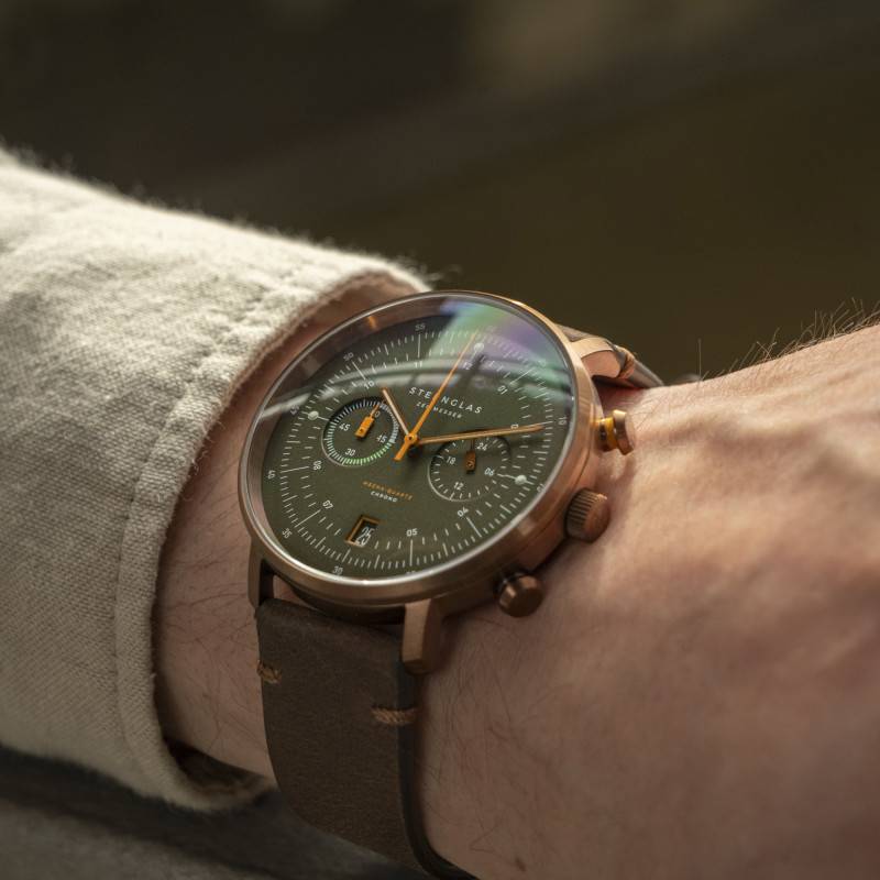 Cette montre Sternglas Hamburg Chrono Dark Green S01-HC35-VI17 incarne l'élégance germanique sous une forme classique et moderne. Avec son boîtier de 42 mm en acier inoxydable 316L recouvert d'un traitement PVD bronze, elle offre un style sophistiqué qui attire l'œil. La couronne et les deux boutons-poussoirs sur le côté droit permettent de commander facilement toutes les fonctions chronographiques.