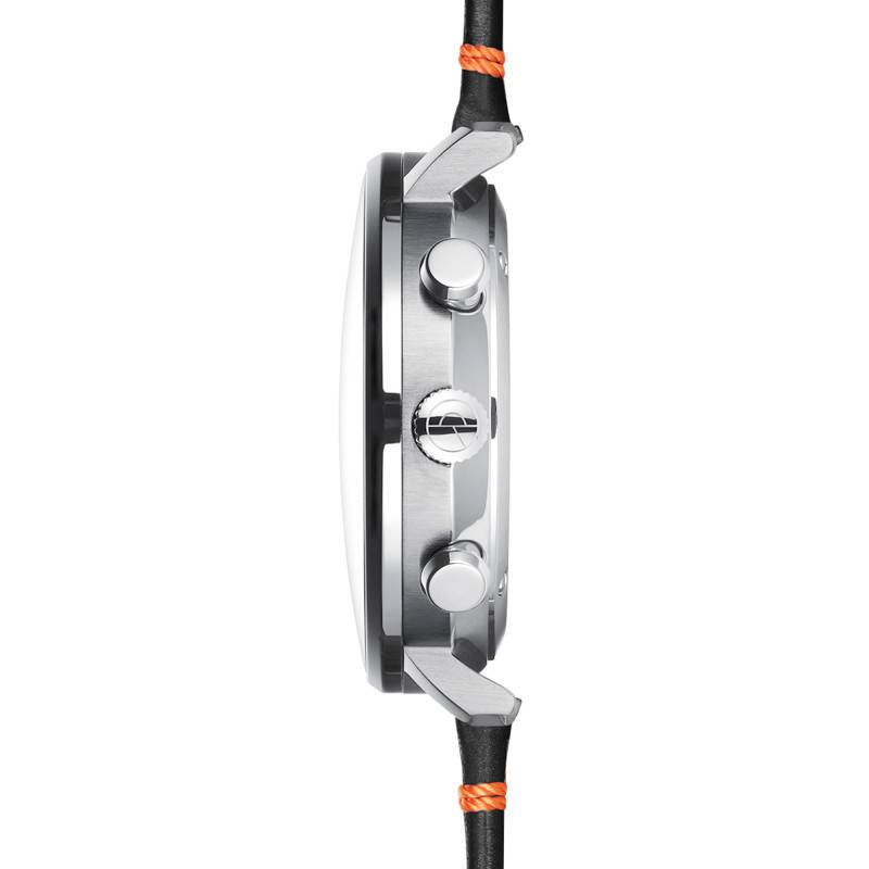 Le bracelet en cuir de vachette noir ajoute une touche distinguée à la montre. Ses surpiqûres orange lui confèrent un style unique et moderne tout en renforçant la structure du bracelet pour une durabilité accrue. D'une largeur de 20 mm, le bracelet assure un confort optimal grâce à sa souplesse et son ajustement parfait au poignet. La boucle ardillon permet une mise en place facile et sécurisée, faisant de cette montre un choix pratique et élégant pour toutes les occasions.