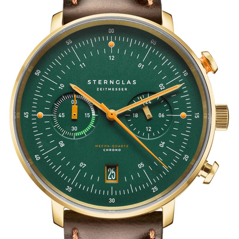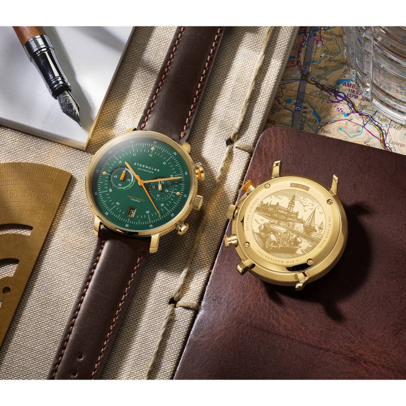 Le cadran de cette montre se distingue par sa couleur verte unique et sa finition matte, soulignant le raffinement de la Hamburg Chrono Edition Vintage. À son centre, les chiffres arabes et les index luminescents facilitent la lecture de l'heure, accentués par des aiguilles luminescentes qui se déplacent avec fluidité sur un affichage analogique classique. L'agencement du cadran inclut un chemin de fer des minutes, ajoutant une harmonie visuelle et une précision dans la lecture du temps. Deux compteurs supplémentaires, dédiés aux durées de 24 heures et 60 minutes, accompagnent le guichet-date situé discrètement pour compléter les fonctionnalités offertes par la montre.