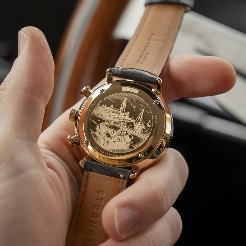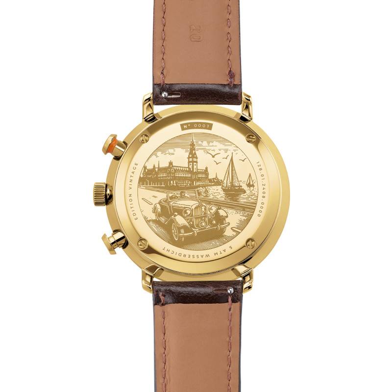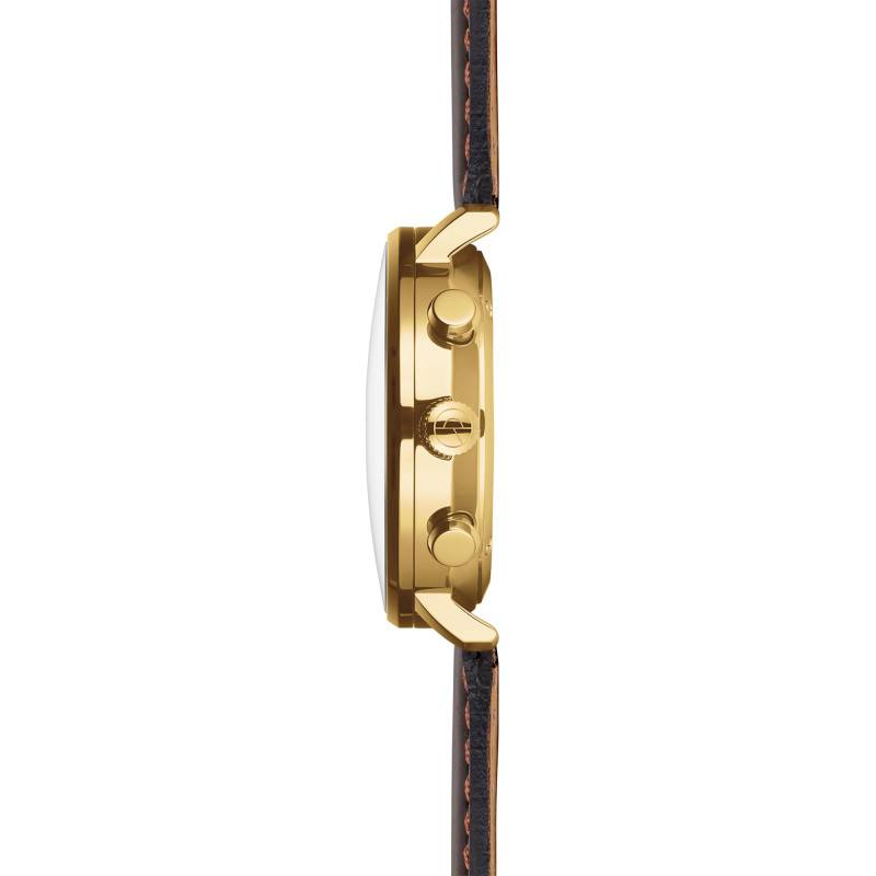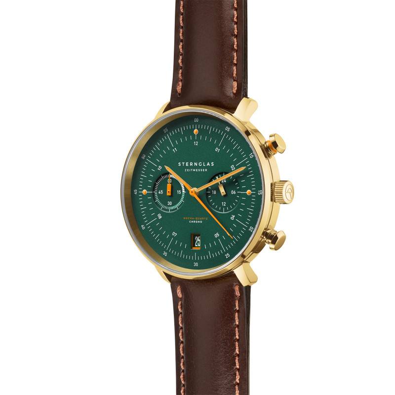 La montre Hamburg Chrono Edition Vintage S01-HCV22-BR01 de la marque Sternglas est une véritable célébration de l'horlogerie allemande. Conçue pour les hommes, elle incarne un mariage réussi entre un design élégant et une fonctionnalité moderne. Le boîtier rond en acier inoxydable 316L de haute qualité assure non seulement la robustesse de la montre mais aussi son allure sophistiquée. Avec son diamètre de 42,00 mm et une épaisseur de 9,50 mm, elle offre une présence confortable et affirmée. La finition PVD jaune, polie et brillante, accentue le caractère audacieux de cette pièce. Il convient aussi de noter la présence d'un verre bombé saphir qui non seulement protège le cadran des rayures mais permet aussi une visibilité optimale grâce à un traitement antireflets.