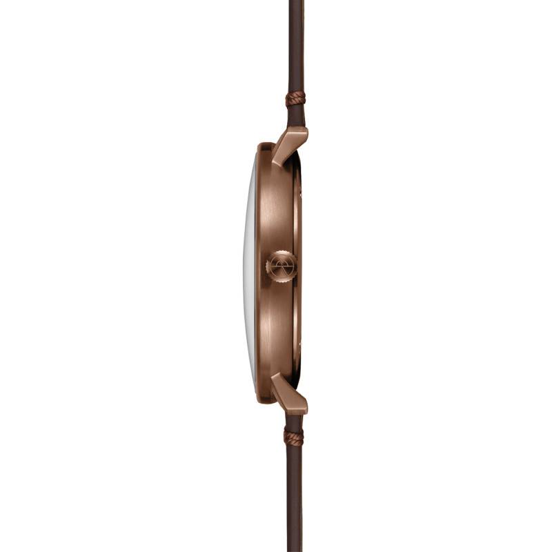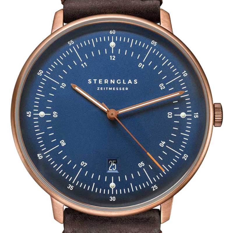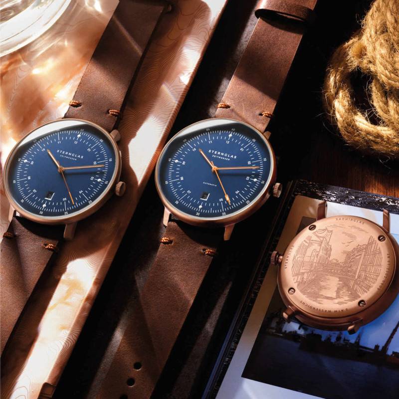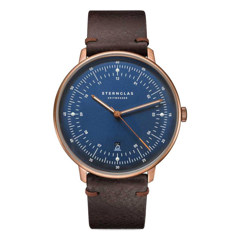 D'origine allemande, la marque Sternglas élabore d'élégantes créations équipées qui seront du plus bel effet sur votre poignet. Ces modèles arborent des designs robustes et charmants qui sont dotés de technologies fiables afin de vous accorder une lecture temporelle simple et juste. Elle vous invite à découvrir la montre Hamburg Dark Blue Bronze Vintage Mocha S01-HH27-VI17 destinée aux hommes. Elle se pare d'un boîtier rond affichant 42 mm de diamètre et 45 mm de longueur sur une épaisseur de 6,00 mm. Ce dernier est réalisé en acier inoxydable 316L poli de traitement PVD bronze, ce qui lui confère cette teinte attrayante. Son cadran est surmonté par un verre saphir bombé avec un double traitement antireflet assurant une protection aux chocs et une lisibilité sans contraintes. Sur celui-ci, sont placés les différents indicateurs qui seront manipulés par la couronne bronze fixée à 3 heures. De plus, cette dernière présente un aspect cranté assurant une prise en main facile. Le tout est fermé par un fond de boîte maintenu par des vis assurant une étanchéité de 5 ATM et dévoilant le fameux pont dont la montre est inspirée.