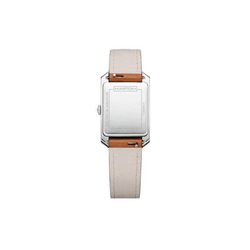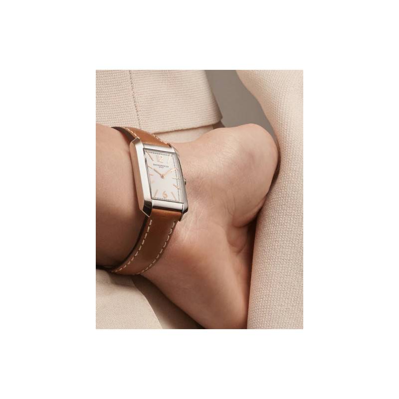 La magnifique maison horlogère Baume & Mercier enrichit sa collection Hampton. Ce modèle féminin présente un boîtier de forme rectangulaire et de couleur grise. Fait en acier poli, il arbore des dimensions typiquement féminines avec 22,2 millimètres de largeur sur 34,96715 millimètres de longueur pour 6,92 millimètres d'épaisseur. Pour protéger le cadran, un somptueux verre saphir le surplombe. Pour une meilleure lisibilité et toujours plus de protection, le verre est légèrement bombé. Il protégera votre montre des éventuels chocs et rayures. Par ailleurs, une couronne remontoir se positionne à trois heures pour vous permettre le réglage des aiguilles des heures et des minutes. Enfin, ce modèle a une étanchéité de 5 ATM grâce à son fond de boîte fermé plein.