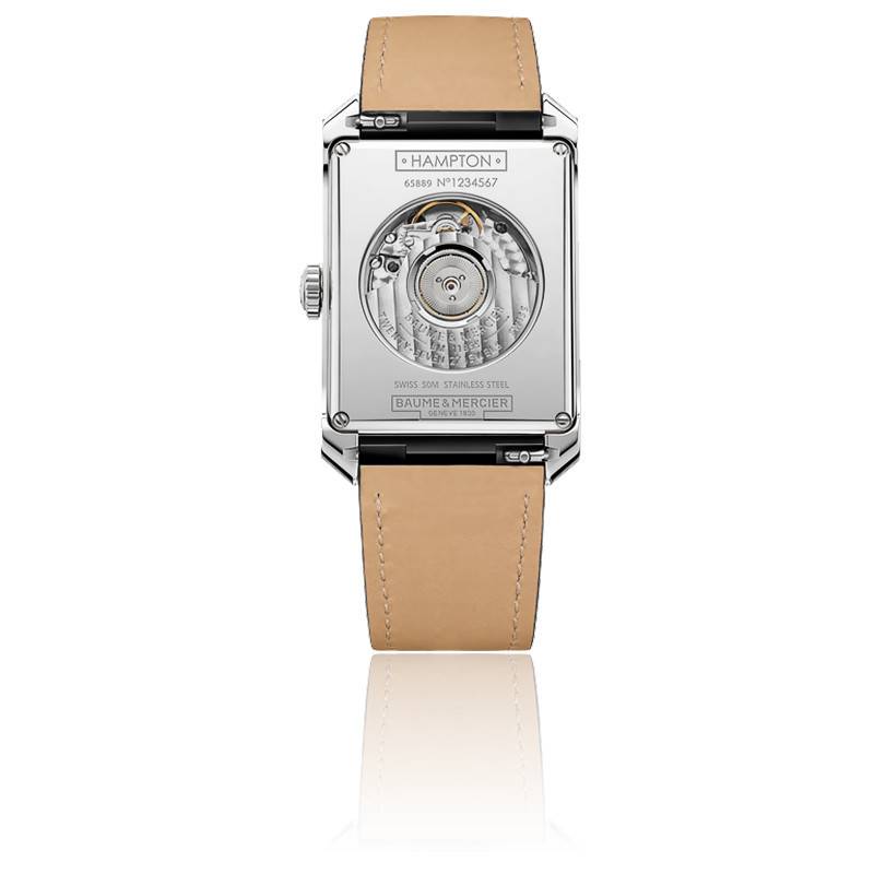 La prestigieuse maison horlogère suisse Baume & Mercier vous propose de découvrir un élégant modèle de la collection Hampton. Il présente un boîtier de forme rectangulaire et de couleur grise. Fait en acier poli, il arbore des dimensions de 31 millimètres de large sur 48,10966 millimètres de longueur pour 9,8 millimètres d'épaisseur. Il se posera délicatement sur les poignets masculins pour vous assurer un look élégant en toutes circonstances. Afin de protéger le cadran, un verre saphir le surmonte. Il protégera votre montre des éventuels chocs et rayures. Par ailleurs, une couronne remontoir prend place à trois heures. Enfin, ce modèle est doté d'un fond de boîte vissé et transparent qui vous assurera une étanchéité de 5 atmosphères, soit jusqu'à 50 mètres de profondeur.