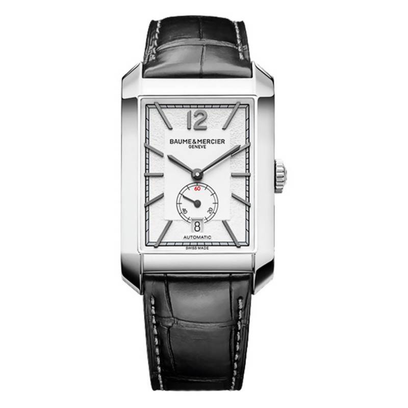 Ce modèle dévoile un sublime cadran de forme rectangulaire et de couleur grise. Ce cadran argenté opalin renferme deux aiguilles glaives indiquant les heures et les minutes. Les repères temporels sont représentés par des index bâtons en ruthénium noir rivetés et des chiffres arabes pour l'index de douze heures. Ils sont accompagnés par un chemin de fer des minutes bâton situé dans le cadre du cadran. De plus, un compteur petites secondes et un guichet-date sont positionnés à six heures pour davantage de précision temporelle. Enfin, ce magnifique cadran est signé par la maison Baume & Mercier sous midi.
