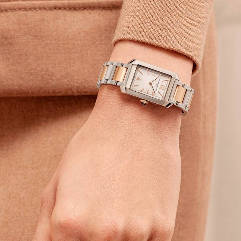 Afin de compléter l'esthétique charmante de ce modèle, la marque a choisi de munir ce modèle d'un bracelet en acier inoxydable. Arborant des maillons polis et satinés de couleurs gris et or rose, il ne manquera pas de vous assurer du confort tout au long de son port et s'accorde à merveille avec l'aspect général de la montre. Son maintien se fera par le biais d'une boucle déployante.