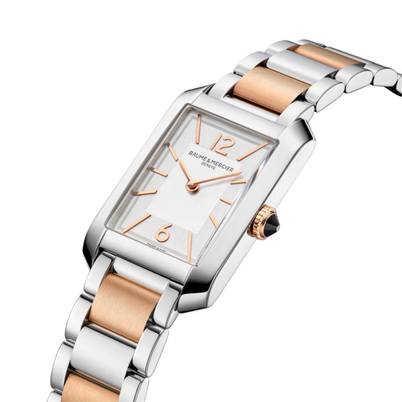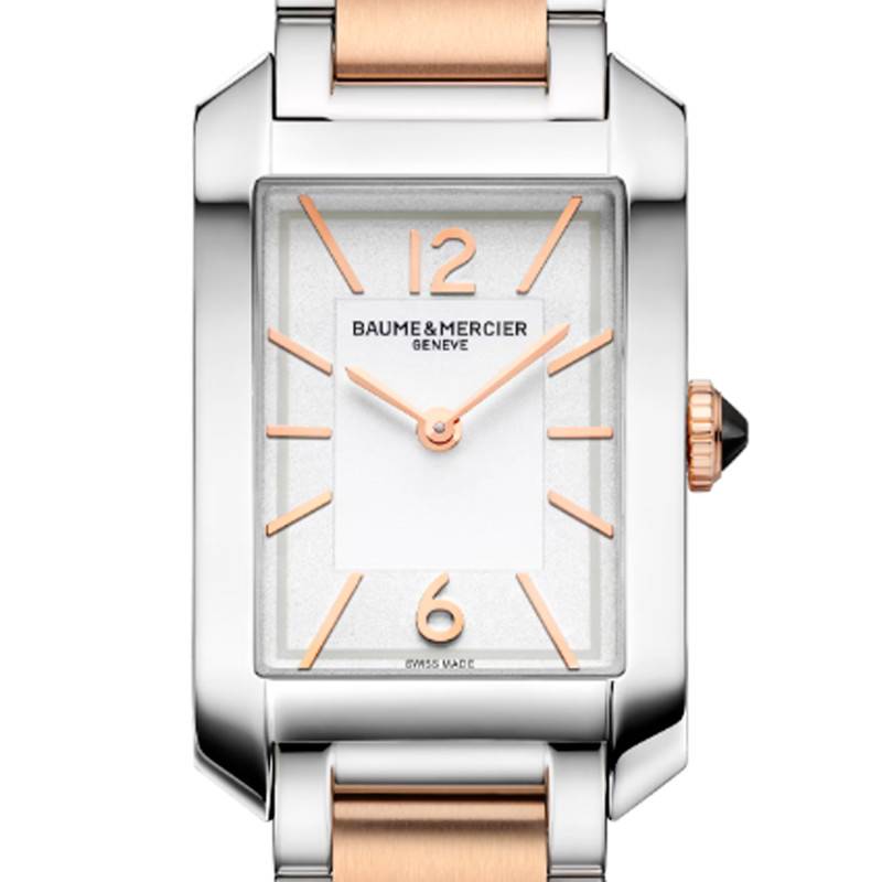 La marque a opté pour orner ce modèle chic et raffiné un cadran gris opalin reprenant la forme du boîtier. Son élégance est mise en avant par des indicateurs de ton rose dorés qui vous communiqueront les heures. Il s'agit d'index en appliques rivés ainsi que de chiffres arabes prenant place à 6h et 12h pour vous permettre de vous repérer plus facilement lors de la lecture du temps. Ces marqueurs seront pointés par les deux aiguilles glaive centrales affichant les heures par la courte et les minutes grâce à la grande. Enfin, pour clore ce cadran en beauté, Baume & Mercier appose sa signature en lettres noires sous 12h et rappelle l'origine à l'opposé.