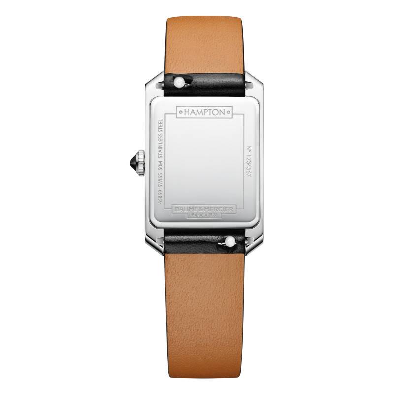 Baume & Mercier est une grande marque qui conçoit des montres qui se distinguent par leurs designs intemporels et sophistiqués. Chaque modèle est le résultat d'une esthétique épurée et d'une attention particulière portée aux détails pour garantir leur haute qualité. Avec un savoir-faire issu de l'horlogerie suisse, cette entreprise ne cesse de prospérer en tant que marque de montres de luxe, offrant ainsi des garde-temps qui incarnent l'élégance, la qualité et l'héritage suisse. Dans la collection Hampton, vous trouverez cette ravissante montre 10760 qui incarne le fameux chic à la française. Elle se démarque par son design élégant et attrayant qui captivera l'attention en tout temps. Celle-ci comprend un boîtier de forme rectangulaire fait en intégralité à partir d'acier inoxydable de finition polie. Il se démarque par sa brillance et sa couleur argentée qui le revêt magnifiquement. Les dimensions de ce dernier sont de 35 mm de longueur, de 22,20 mm de largeur et de 6,90 mm d'épaisseur. Ces mesures siéront à merveille aux poignets des femmes au quotidien. Par ailleurs, le verre saphir qui surplombe ce boîtier se charge de protéger le cadran des rayures et des chocs externes pouvant nuire à son esthétique. À 3 heures, vous trouverez un bouton remontoir qui donne l'accès au régalage aisé des aiguilles centrales selon votre convenance. Enfin, le fond emboîté de ce garde-temps est gravé des caractéristiques propres au modèle. Il confère une étanchéité de 10 ATM, soit 100 mètres de profondeur.