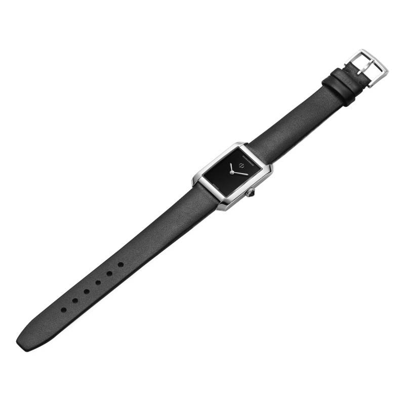 Le cadran rectangulaire de cette montre affiche un design minimaliste mais séduisant. Son fond est de couleur noire et de finition laquée qui lui accorde une très belle allure. Dépourvu d'index, ce cadran présente en son centre deux aiguilles glaives de teinte argentée. Elles s'actionnent pour communiquer les heures et les minutes. Pour terminer, la marque a choisi d'apposer son nom vers midi avec son logo tandis que le lieu de fabrication est mentionné vers 6 heures.