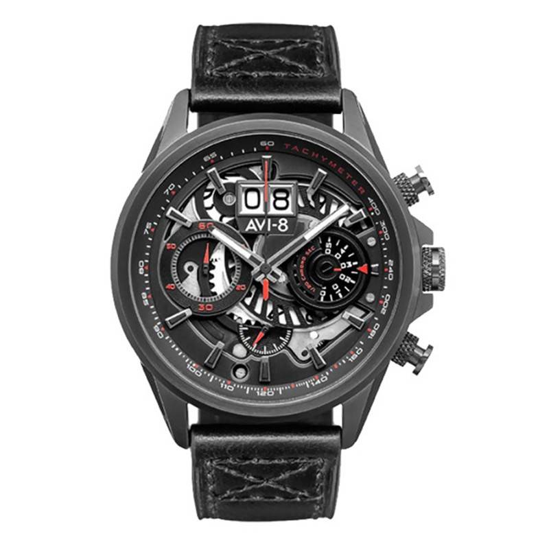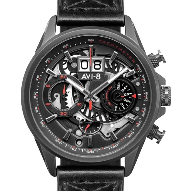 Vous pourrez ressentir via ce cadran l'univers de l'aviation. Ce cadran de forme ronde vous dévoile le mécanisme de la montre grâce à un fond squelette qui permettra de distinguer les engrenages de la montre. Sur un fond de couleur noir et gris, vous trouverez au centre de la montre trois aiguilles. La trotteuse ornée de rouge à ses extrémités vous indiquera les secondes. Les aiguilles des heures et des minutes sont dotées d'une couleur blanche faisant référence au traitement luminescent présent. Ce dernier vous permettra de voir ces aiguilles même dans des milieux à faible luminosité. Une lunette tachymétrique entoure le cadran. Apportant un côté sportif à la montre, cette lunette vous sera utile dans la pratique de vos activités. Des index viendront se poser sur le contour du cadran et feront écho aux aiguilles. Ce cadran original dispose de trois compteurs. Vous trouverez donc à trois heures un compteur 1/20ème de seconde, à six heures un compteur petites secondes et à neuf heures un compteur 60 minutes. Un guichet double grande date placé sous l'index de midi vous permettra d'avoir la date du jour en permanence. Enfin, Avi-8 appose son nom sous le guichet.
