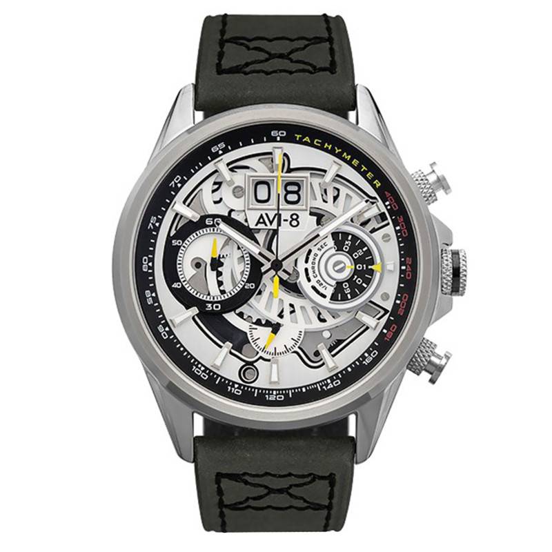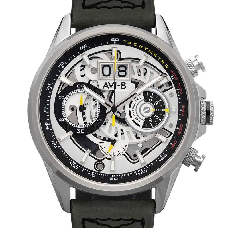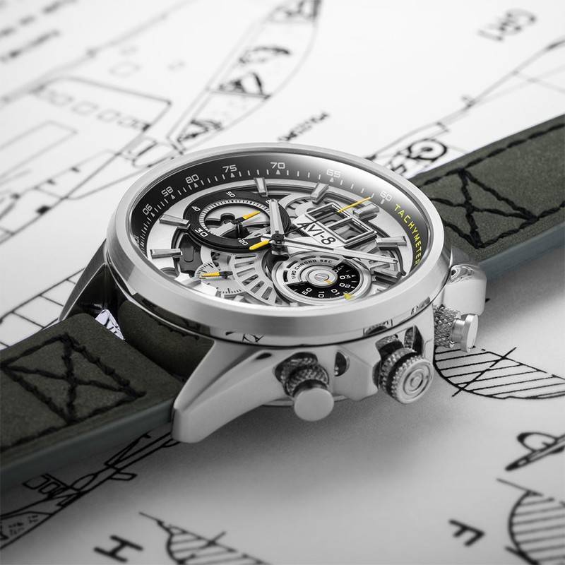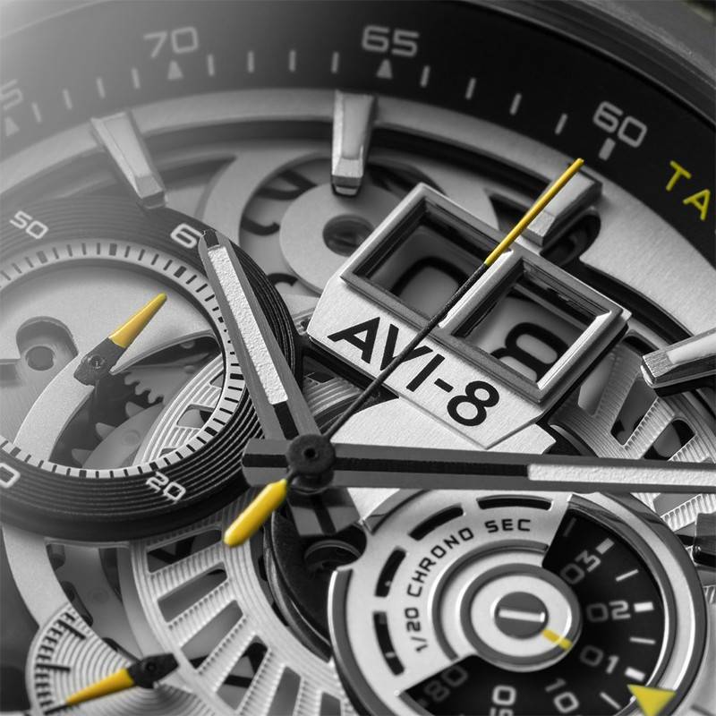 Impressionnant au premier abord, ce cadran AVI-8 saura tout de même vous séduire. Doté d'une forme arrondie, il dispose d'un fond blanc squelette, ce qui vous permet de contempler avec admiration le mécanisme horloger. Juste au dessous de la lunette argentée, un chemin de fer des minutes prend place. Celui-ci vous servira au final à utiliser la fonction tachymètre de ce chronographe. Les index des heures sont quant à eux matérialisés par de fines appliques bâtons argentées et luminescentes. Au coeur, ce sont trois aiguilles qui s'agitent. Celles des heures et des minutes se présentent sous la forme de deux rectangles de couleur argent, dont la pointe est recouverte d'un traitement luminescent. La trotteuse marque l'originalité en teintant sa pointe d'une attrayante couleur jaune. Par ailleurs, ce chronographe compte sur trois compteurs. Celui de 3 heures est un compteur 1/20 de secondes, à 6 heures il s'agit d'un compteur petite seconde tandis que le troisième logé à 9 heures indique les minutes. Les aiguilles de ces compteurs empruntent d'ailleurs la même teinte jaune que celle de la trotteuse, apportant modernité et harmonie à l'ensemble. Sous l'index de 12 heures, un guichet double appelé guichet "grande date" prend place, suivi de la signature "AVI-8" de la maison.