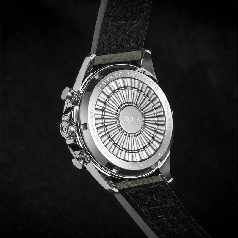 Lorsqu'un avion se transforme en montre de qualité, cela donne un modèle AVI-8. Ce nouveau chronographe intitulé Hawker Harrier tient son nom d'un célèbre avion ayant servi à l'armée au cours du XXème siècle. Innovant pour l'époque, cet avion se décline aujourd'hui sous la forme d'un garde-temps, superposant engrenages et rouages au sein d'un boîtier squelette. Ce boîtier en acier inoxydable possède un diamètre de 44 millimètres. Sur celui-ci un bouton remontoir vient se poser entre deux garde-couronnes au niveau de trois heures. Ce dernier s'accompagne de deux boutons poussoirs, servant à activer les fonctionnalités de ce chronographe. Son cadran d'inspiration aéronautique est protégé par un verre minéral. Au verso, ce modèle emprunte le design de la turbine d'un moteur Rolls Royce Pegasus, renforçant l'aspect travaillé du boîtier. Emprunt d'histoire, ce garde-temps conférera une allure certaine à votre poignet.