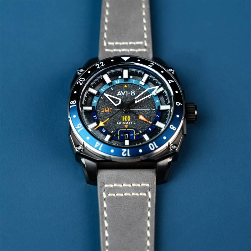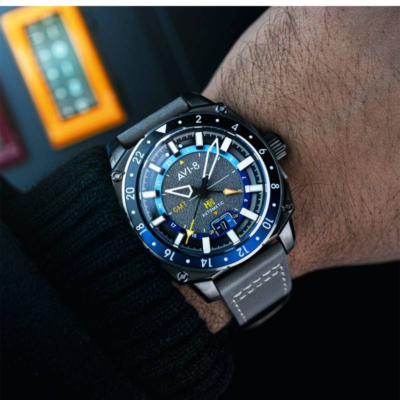 La montre Avi-8 Hawker Hunter Atlas GMT Automatic Mist Grey se distingue par son allure imposante et sa fonctionnalité élevée, idéale pour les amateurs d'aviation et les aventuriers modernes. Ce garde-temps dispose d'un boîtier rond en acier inoxydable, d'un diamètre de 44 mm, une épaisseur de 14 mm, et un poids de 110 g, ce qui lui assure une présence remarquable au poignet sans toutefois sacrifier le confort. La lunette en aluminium et le fond de la montre vissé garantissent une longévité accrue, faisant de ce modèle un véritable compagnon de voyage infaillible.
