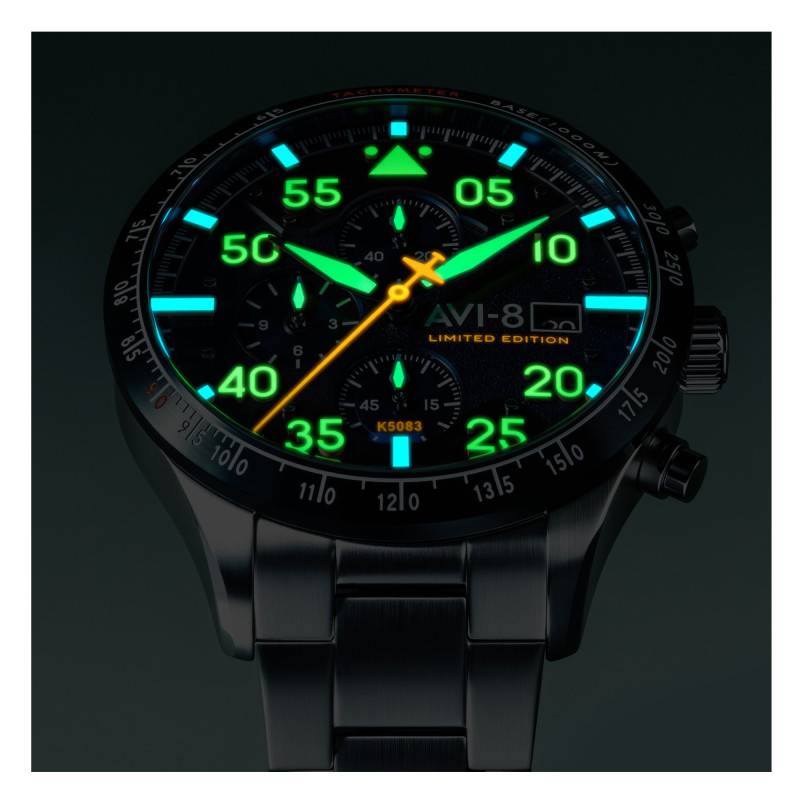 Le cadran de cette montre affiche une couleur bleue intense, inspirée des vastes horizons qui ont vu naître le célèbre Hawker Hurricane. Les chiffres arabes jaune vif assurent une lisibilité immédiate, rehaussant le caractère dynamique et résolument contemporain de la pièce. Ces chiffres se trouvent sur un fond subtilement texturé pour accentuer l'effet tridimensionnel. Les aiguilles fines et luminescentes glissent le long du cadran, assurant ainsi une lecture claire même dans l'obscurité, tandis que le chemin de fer des minutes apporte une précision à chaque instant. Le guichet date complète cette harmonie visuelle, assurant que cette montre reste à la fois fonctionnelle et esthétiquement plaisante.