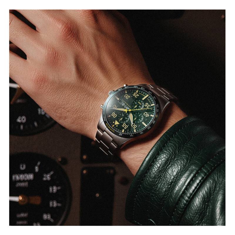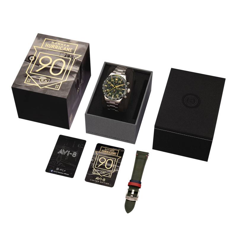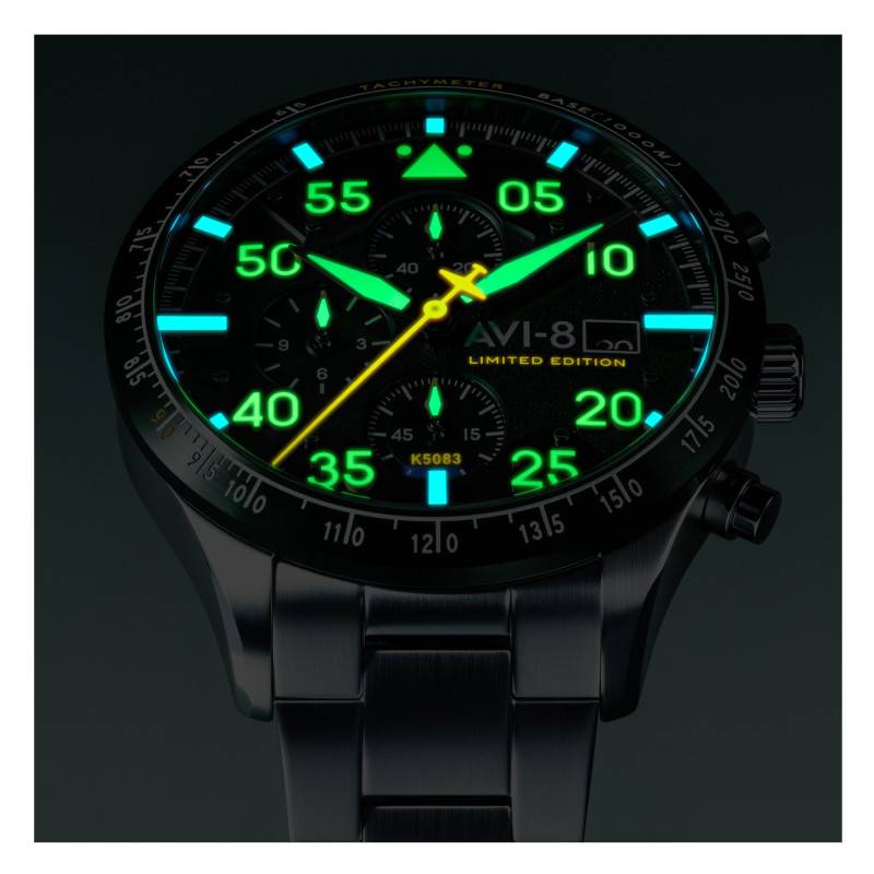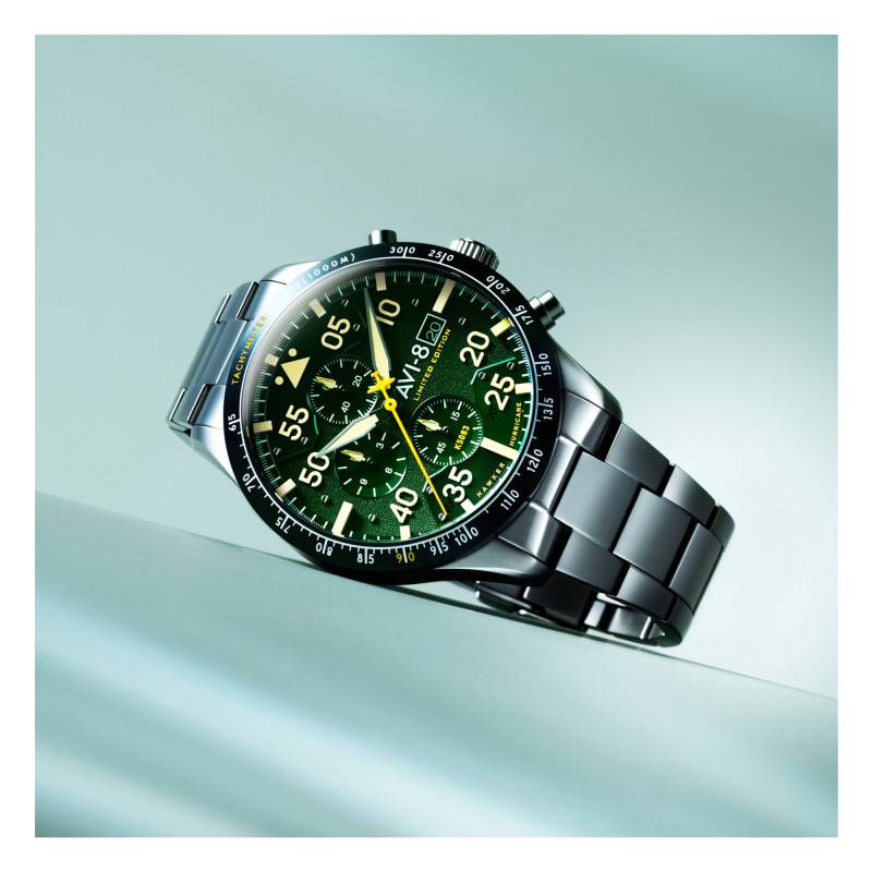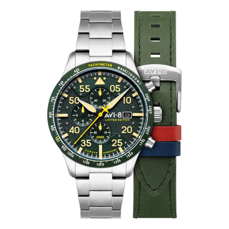Le cadran de couleur verte se distingue par son apparence inspirée directement du cockpit du légendaire aéronef Hawker Hurricane. Les chiffres arabes accompagnés d'index luminescents et d'un chemin de fer des minutes s'ajoutent au design fonctionnel. Ce duo d'esthétique et de commodité est complété par des aiguilles luminescentes, permettant une lecture facile de l'heure dans des conditions de faible luminosité. Complétant le tout, un guichet date vient s'intégrer harmonieusement dans cette configuration.