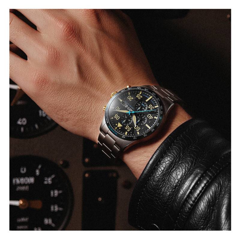 Le cadran de cette montre est une ode au design fonctionnel et à l'esthétique de l'aviation. Arborant un fond noir grainé, il offre une base subtile et texturée qui oriente l'œil vers les éléments principaux. Les aiguilles et index luminescents en chiffres arabes et le chemin de fer des minutes améliorent la lisibilité, même dans l'obscurité. Trois compteurs de chronographe sont habilement intégrés pour mesurer le temps avec une précision accrue, un clin d'œil direct aux instruments de bord des avions. En complément, un guichet discret affiche la date, offrant une fonctionnalité supplémentaire sans compromettre le style. Grâce au verre minéral doté d'un traitement antireflets, le cadran reste lisible sous toutes les conditions lumineuses.