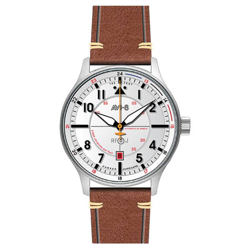 Le fond de cadran est blanc. Il se dote d'un réhaut comptant via des chiffres arabes noirs et rouges de 12 à 24 heures. En noir figurent ensuite un chemin de fer des minutes et des chiffres arabes notifiant les 12 premières heures manquantes. Les aiguilles blanches et noires des heures et des minutes vous orientent ainsi de manière précise. Un cercle plus central contient des inscriptions en rouge destinées à préciser le mouvement de la montre, présenter un guichet date et indiquer les secondes. Afin de rappeler l'esprit de la maison, la trotteuse orange prend la forme d'un avion et Avi-8 laisse son nom sur la partie supérieure du cadran.
