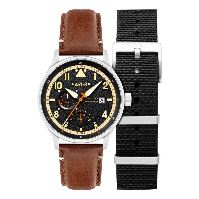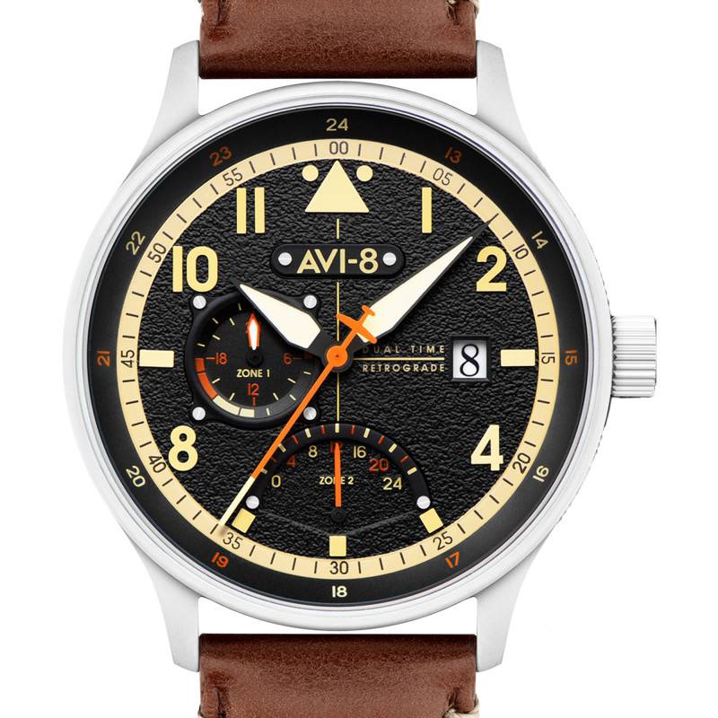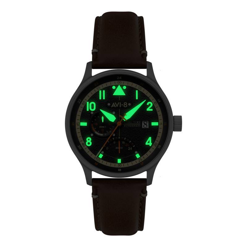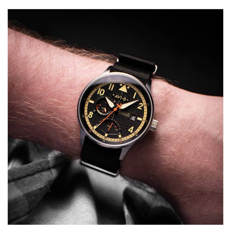 Le cadran de cette montre Avi-8 opte pour une finition grainée qui ajoute de la profondeur à l'ensemble, et capte subtilement la lumière en procurant un aspect dynamique. Sa couleur noire est judicieusement contrastée par des chiffres arabes et des index luminescents, rendant la lecture de l'heure non seulement aisée mais également agréable. Les aiguilles, également luminescentes, parcourent un cadran circonscrit par un chemin de fer minuté, garantissant une précision de lecture optimale. Le choix du verre minéral pour protéger le cadran est axé sur la robustesse et la clarté, offrant ainsi une vue dégagée sur les différentes complications affichées, parmi lesquelles un guichet date se distingue harmonieusement à 3 heures. L'affichage analogique est rehaussé par la présence d'un compteur 24 heures supplémentaire, complétant la fonctionnalité dual-time essentielle pour les voyageurs.